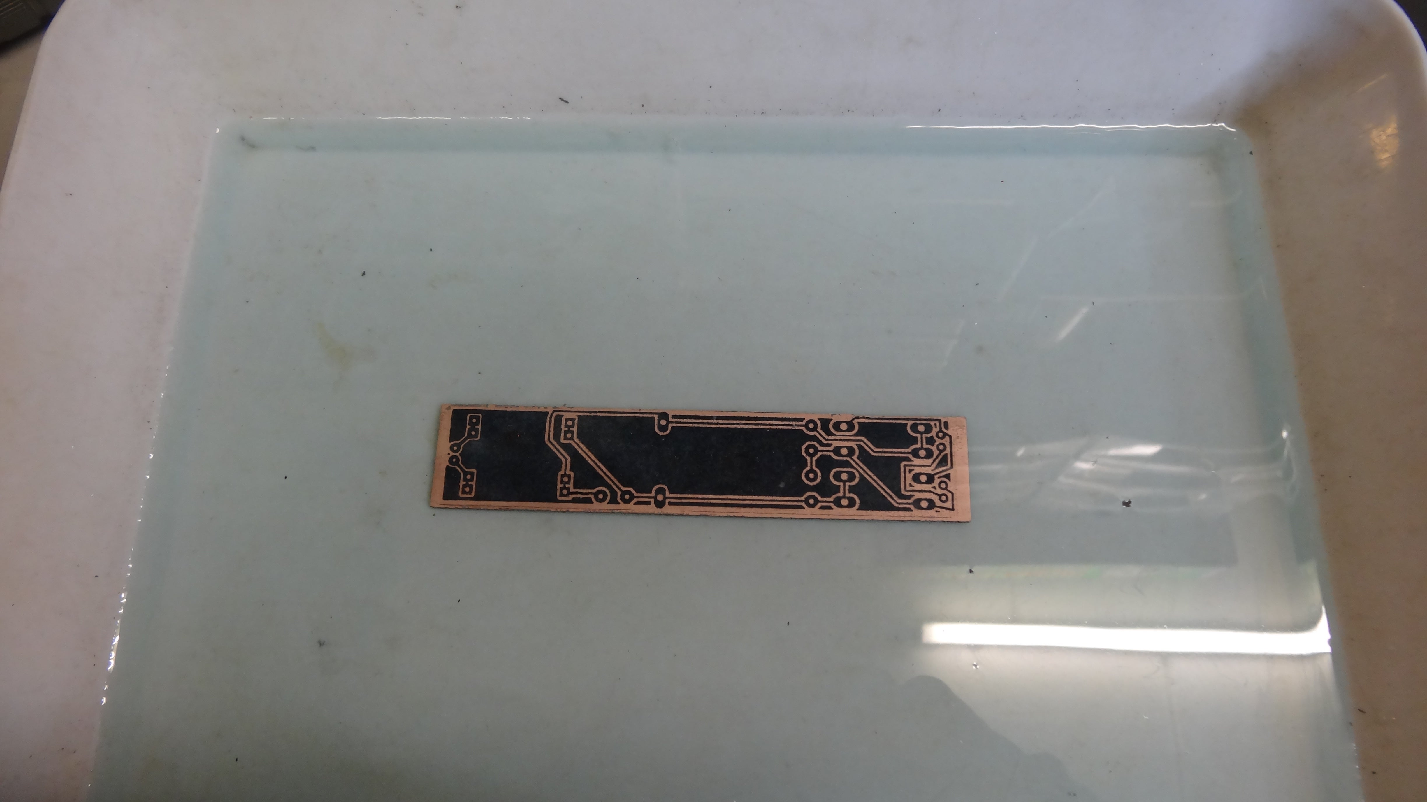 After some minutes, the PCB is completely etched. Now you can remove the toner with aceton and check that everything is etched fine.