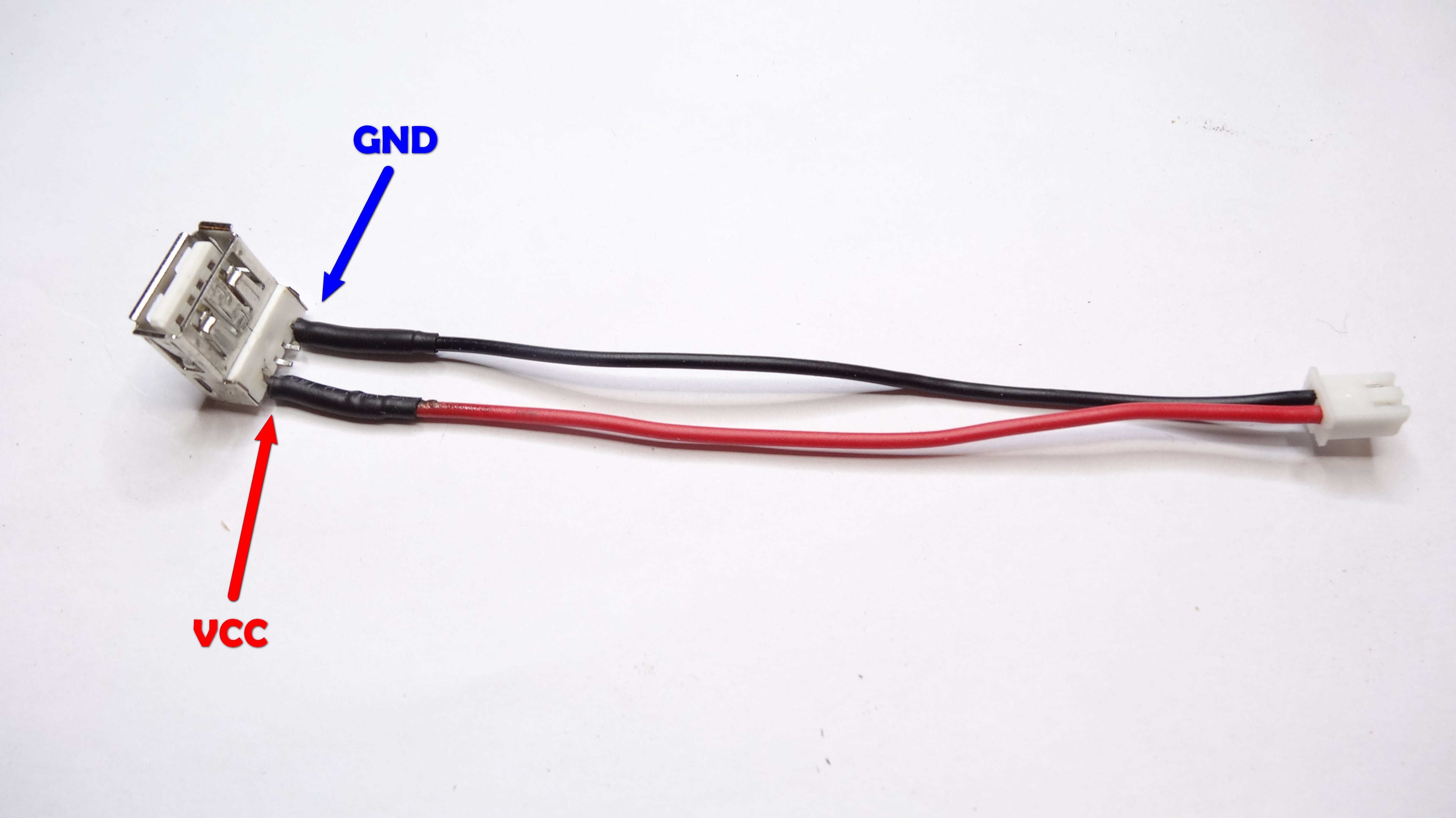 At first you have to solder the the two wires to the USB-A plug. Isolate it with some heat shrink tube. After that you need to crimp the XH2.54 plug to the wires. For the right orientation of VCC and GND, please refer to the pictures below: