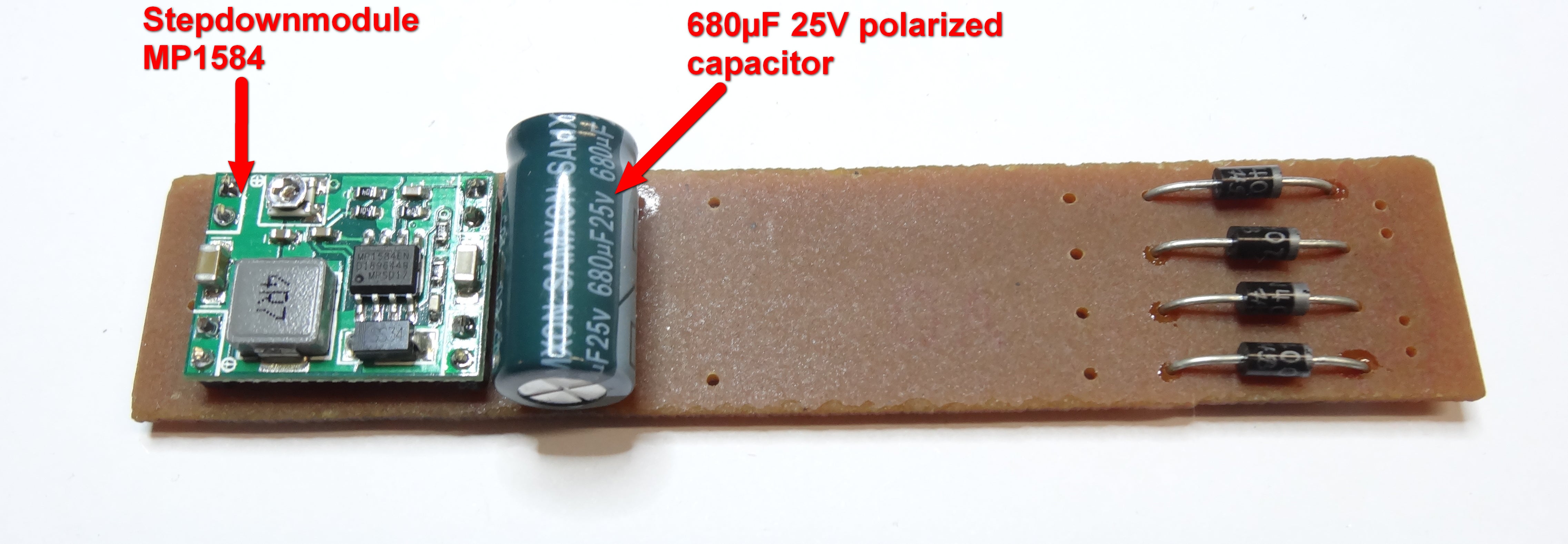 After that you can mount the preadjusted to 5V Stepdownmodule and the 680µF capacitor at the left side of the PCB.