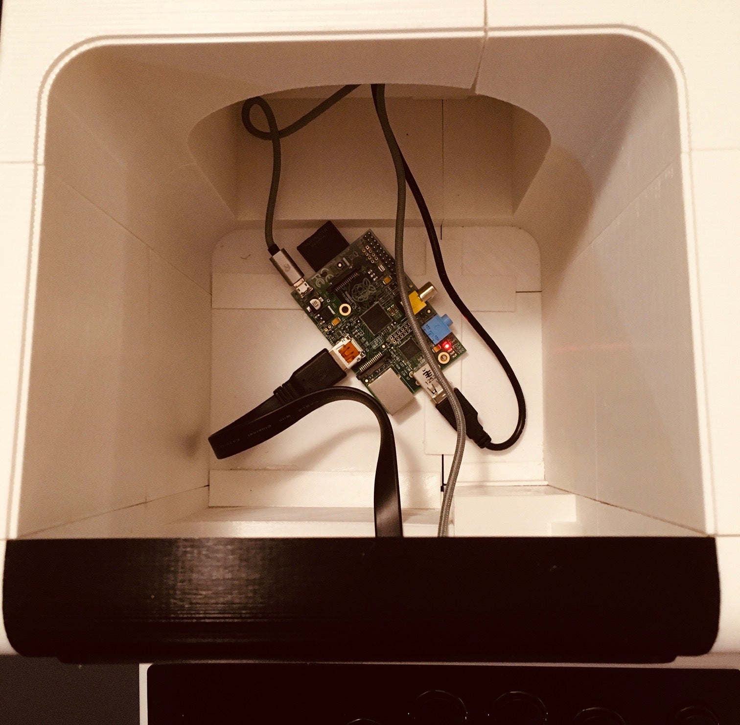 - It's a little hard to see but I printed a "caddy" for the Pi (with hat) and glued it to the bottom of reproduction. I then secured the Pi into this holder with double sided tape.