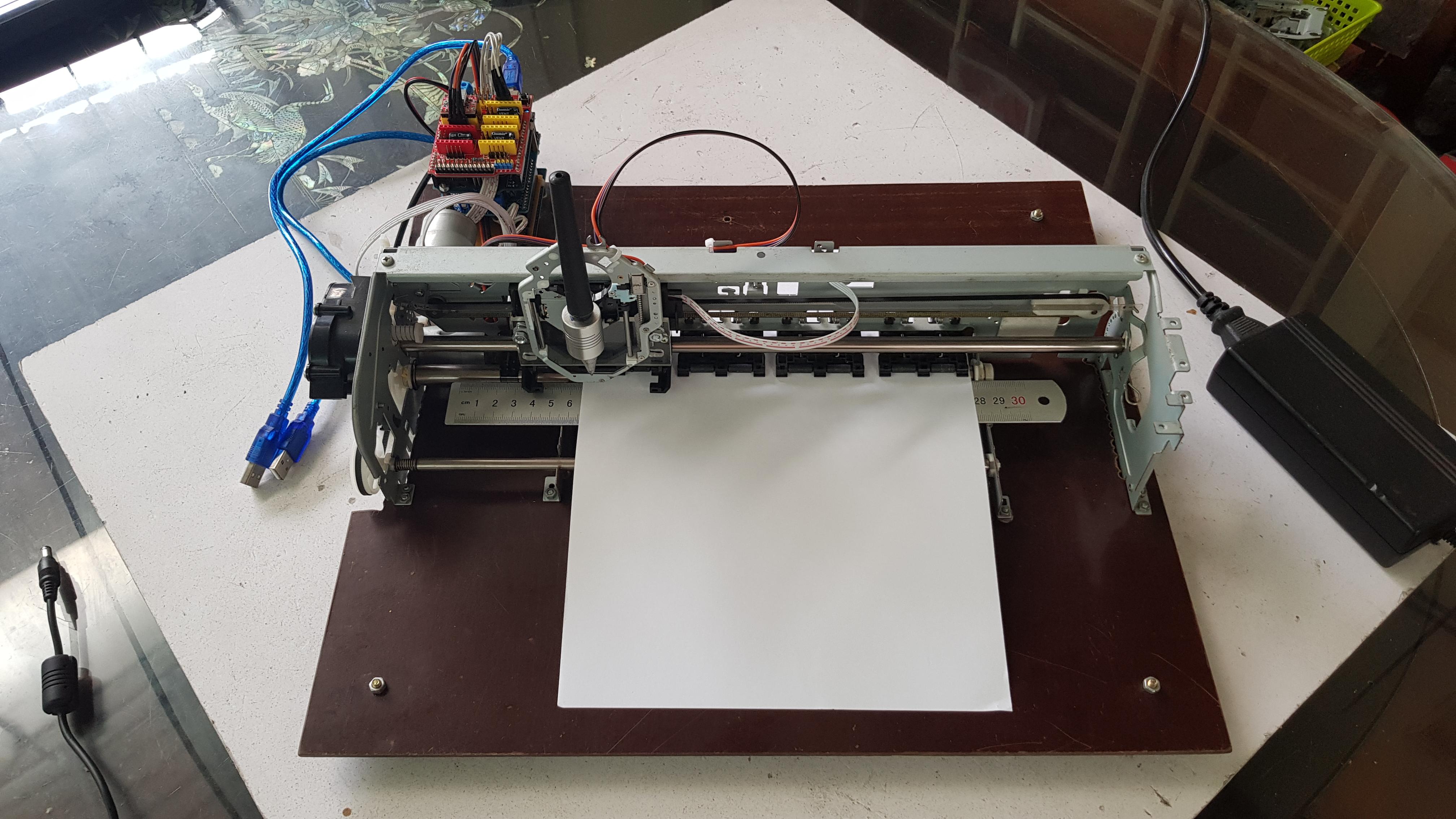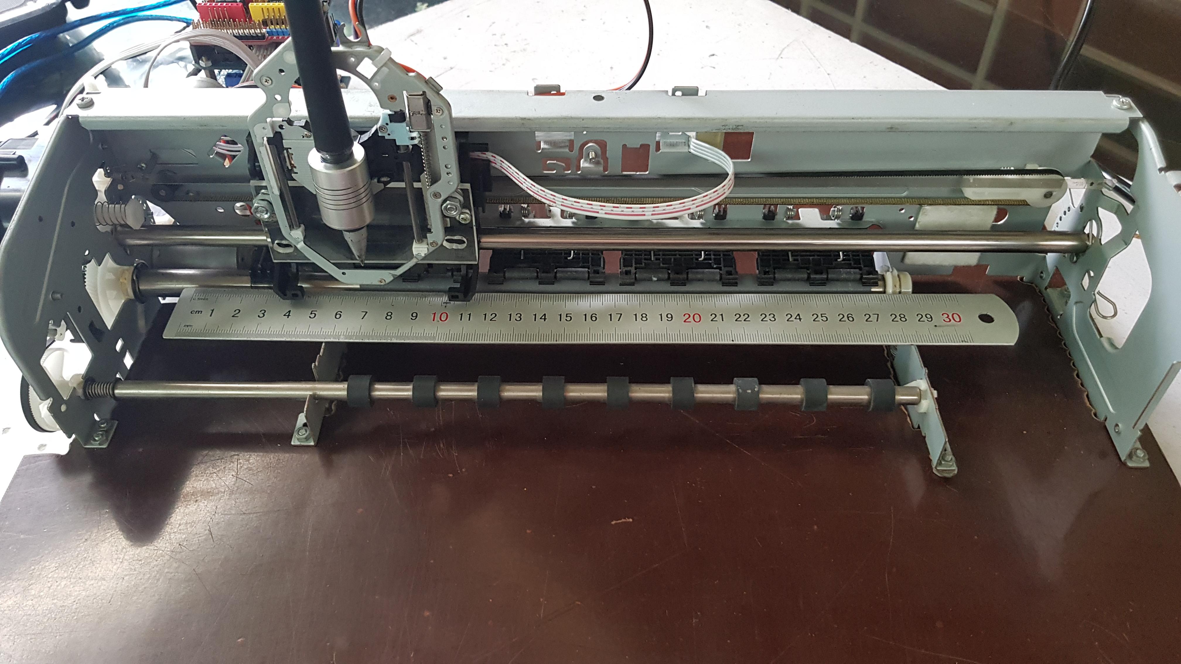 - For testing, I used a thin ruler to creat plotting surface of Y axis. Take note that the distance from the center of printer roller to the pen tip is as short as possible, it is about 20 mm in my case.