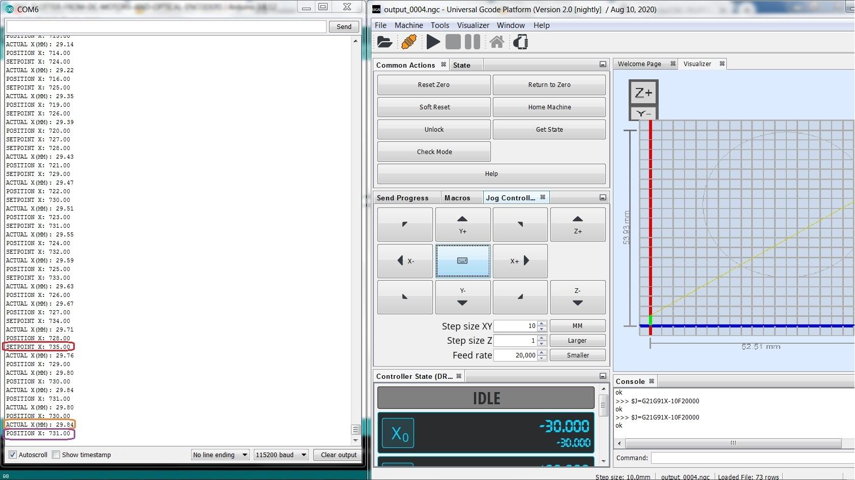 - Firstly, I connected Universal Gcode Sender program to Arduino Uno (with GRBL), set $101 = 7128 in tab "Firmware Setting". The purpose is I want to check when I command Y axis to move 1mm, the Arduino Mega 2560 will generate PMW to move the DC motor and count 7128 pulses feedback from optical encoder.