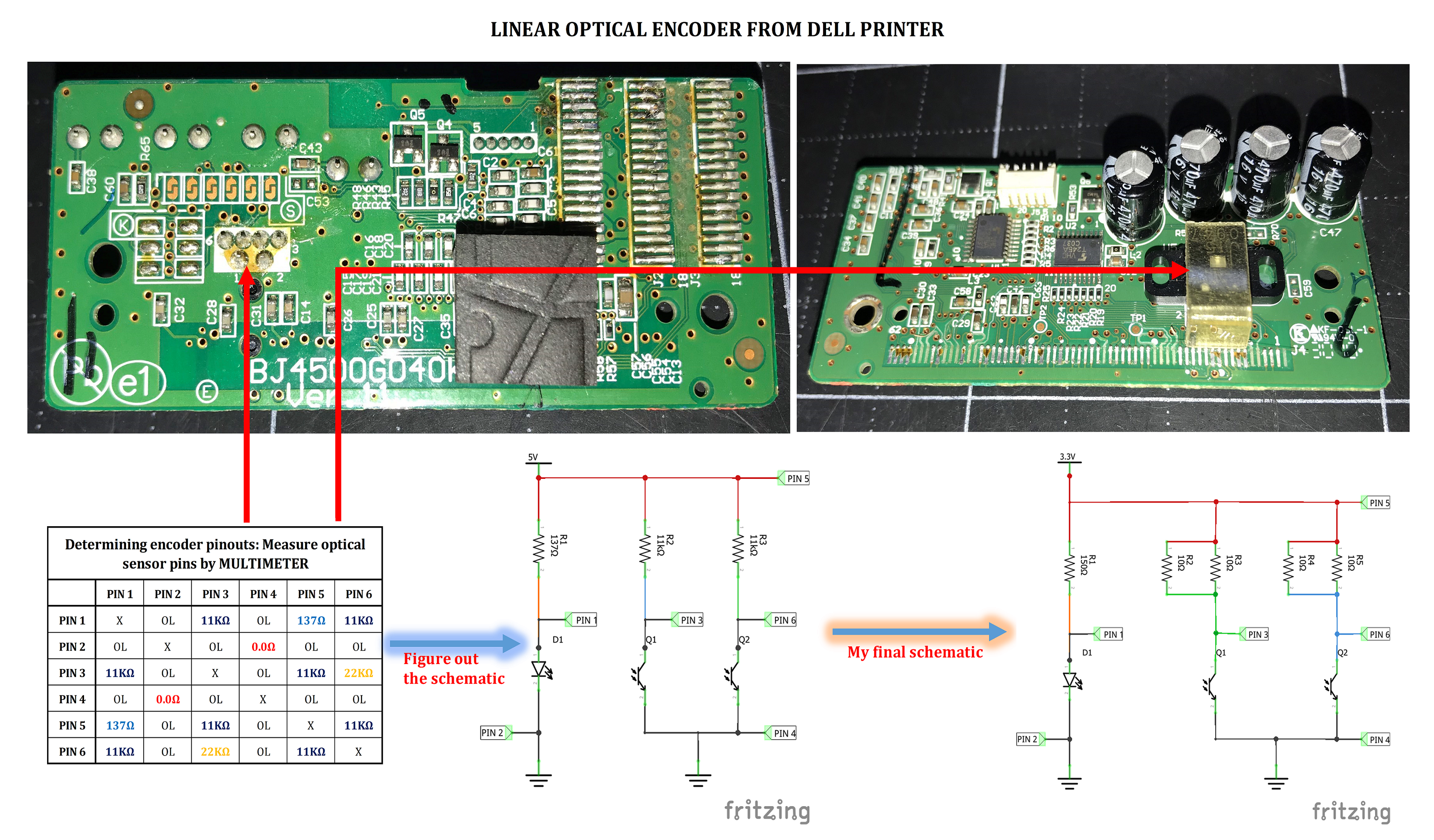 I couldn’t find part number, manufacturer or data sheets on these optical encoders. In this case, I used a multimeter to measure the resistance among optical sensor pins (6 pins in my case) to identify its pinouts: VCC, GND, channel A, channel B. As mentioned in previous step, there are 2 kinds of optical encoders in DELL printer: X axis linear optical encoder and Y axis rotary optical encoder.