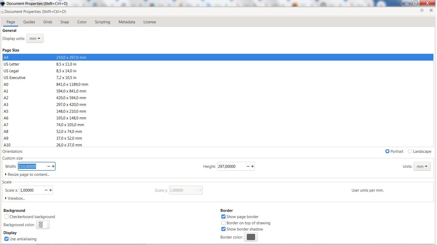 - From the Inkscape menu go to File ‣ Properties and in the Page Tab set the Display Units (millimeters), the Orientation to Portrait and Page Size A4: 210.0 x 297.0mm.