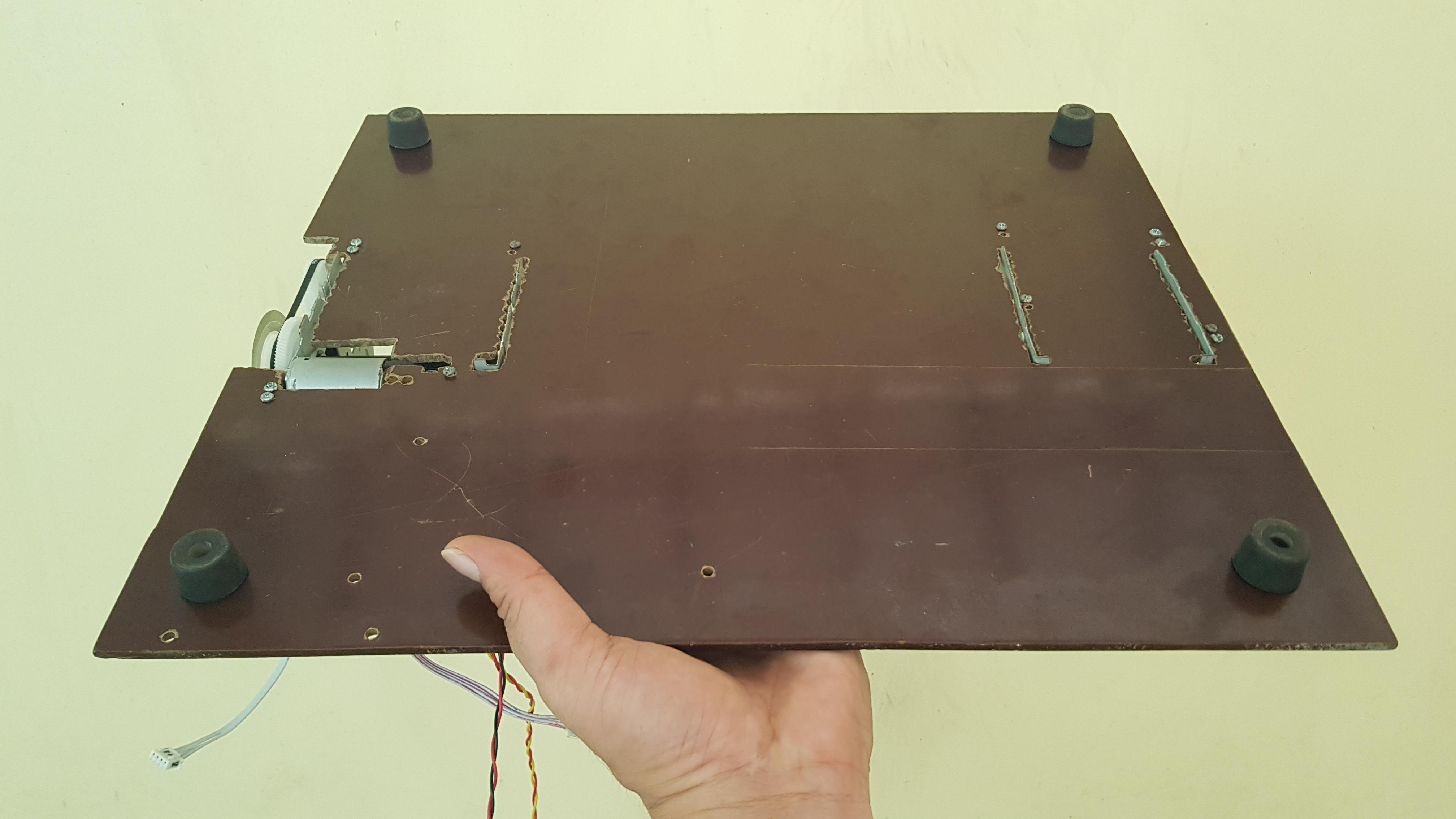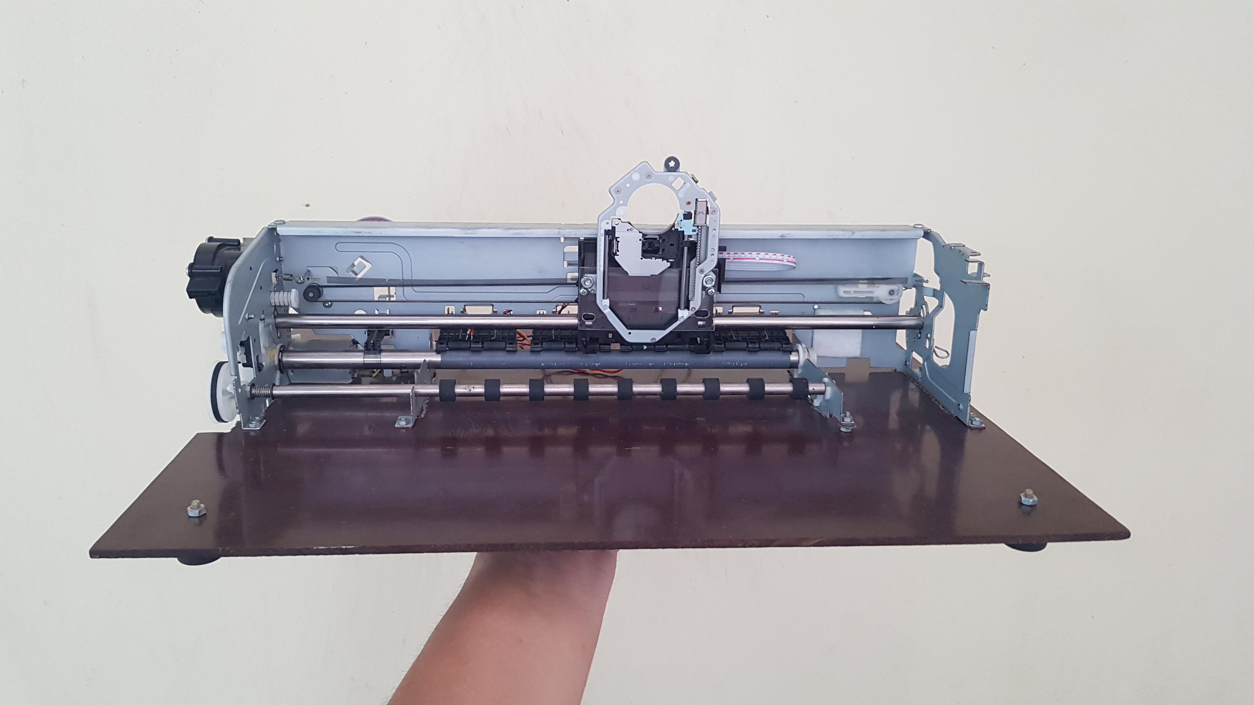 I had one Dell printer that stops working and I disassembled it into small components. This printer head frame has 2 DC motors and 2 optical encoders which are still in good condition & can be reused to build XY axis for the CNC plotter.