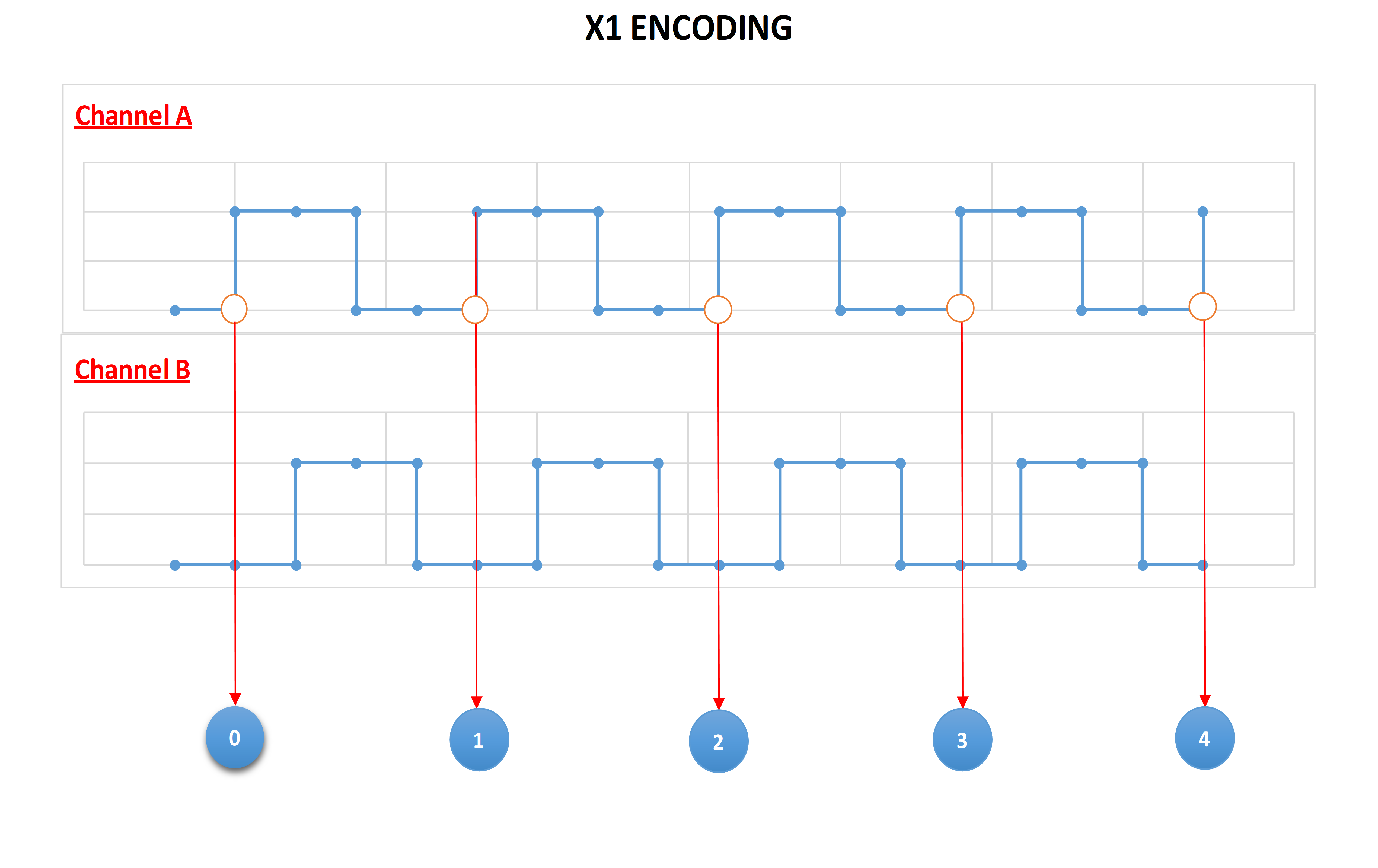 X4 encoding: both the rising and falling edges of channels A and B are counted. When X4 encoding is used, it increases encoder resolution by four times.