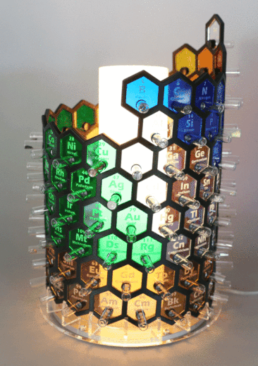 The first periodic table was developed in 1862 by a French geologist called Alexandre-Émile Béguyer de Chancourtois. He plotted the elements on a cylinder with a circumference of 16 units, and noted the resulting helix placed elements with similar properties in line with each other. But his idea - which he called the "Telluric Spiral", because the element tellurium was near the middle - never caught on, perhaps because it was published in a geology journal unread by chemists, and because de Chancourtois failed to include the diagram and described the helix as a square circle triangle. Mendeleev got all the glory, and it is his 1869 version (dramatically updated, but still recognizable) that nearly everyone uses today. This instructable documents my efforts to reimagine a 3D periodic table of the elements, using modern making methods. It's based on the structure of a chiral nanotube, and is made from a 3D printed lattice, laser cut acrylic, a lazy susan bearing, 118 sample vials and a cylindrical lamp.