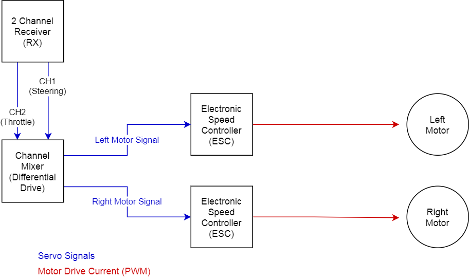 Below is a simplified diagram which shows how the control signal from the transmitter is received, then remapped to a control signal for each motor.