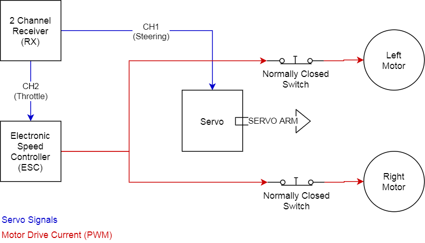 I didn't have two ESCs available during our Pandemic Lockdown and couldn't get more so I had to come up with a solution. It came to me that I could use one ESC to control the speed of both motors and simply use a servo to actuate a switch, cutting current to one motor, which would result in steering action.