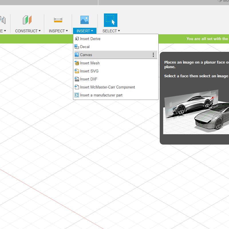 In Fusion you can go to the "INSERT" menu and hit the "Canvas" button to insert an image on the selected plan as a canvas.