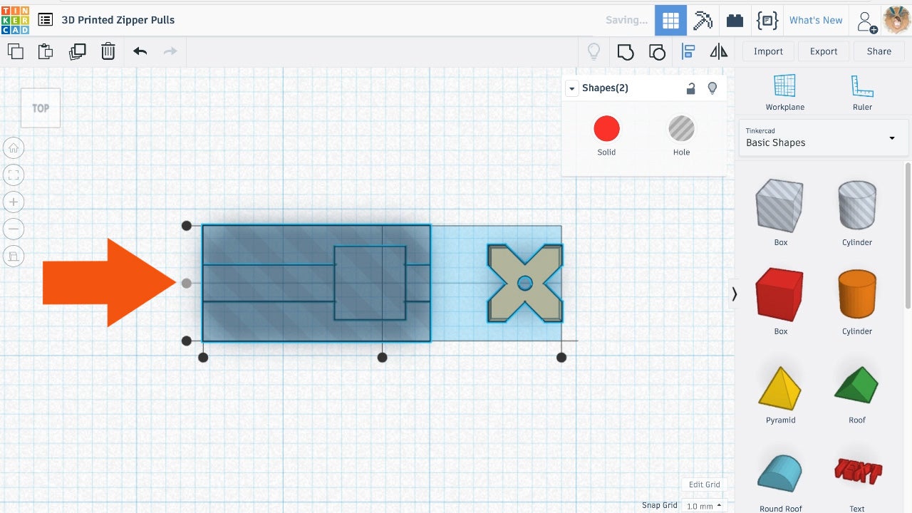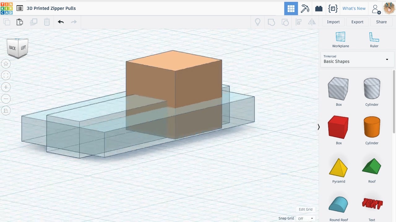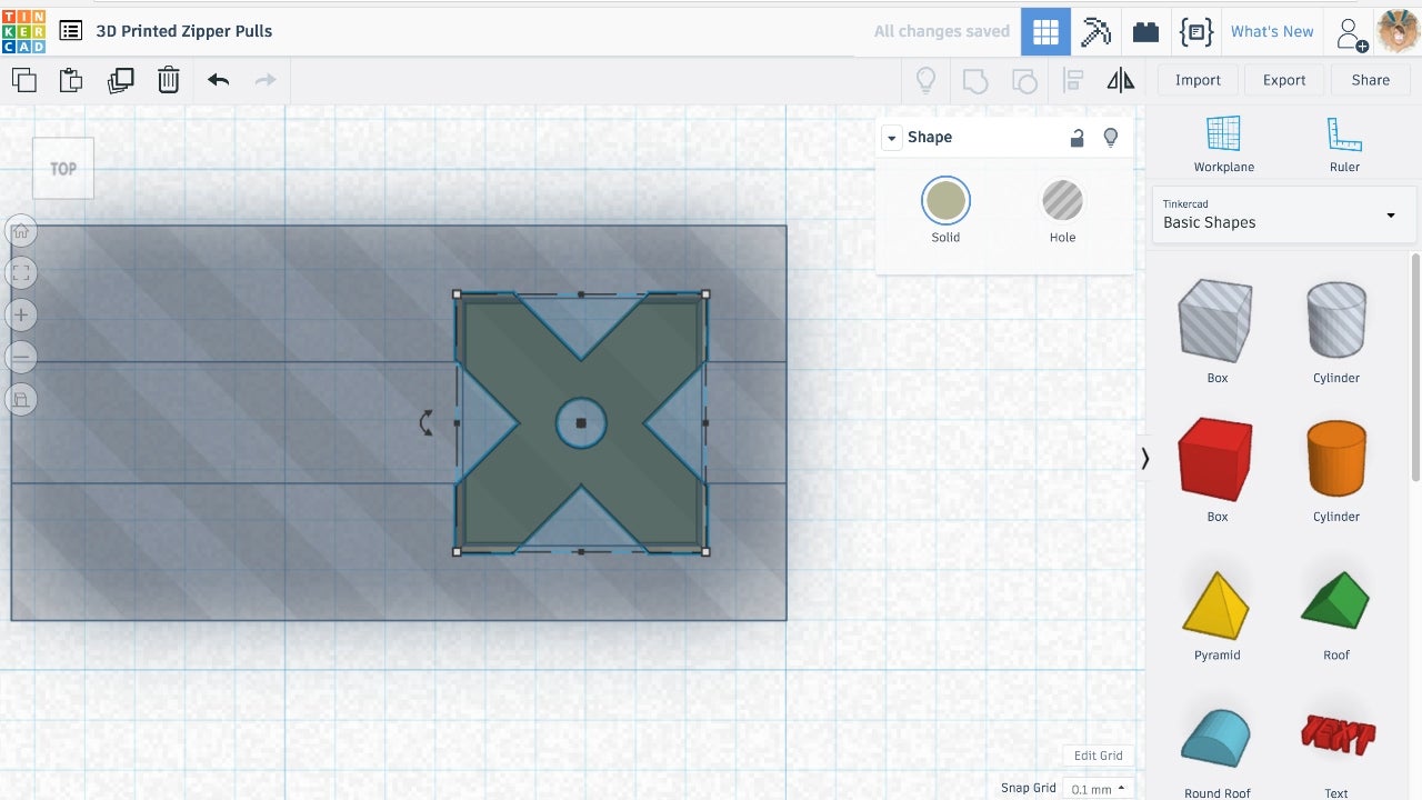 - Drag a third box onto the workplane OR a cylinder if your zipper pull hole is round or ovular.