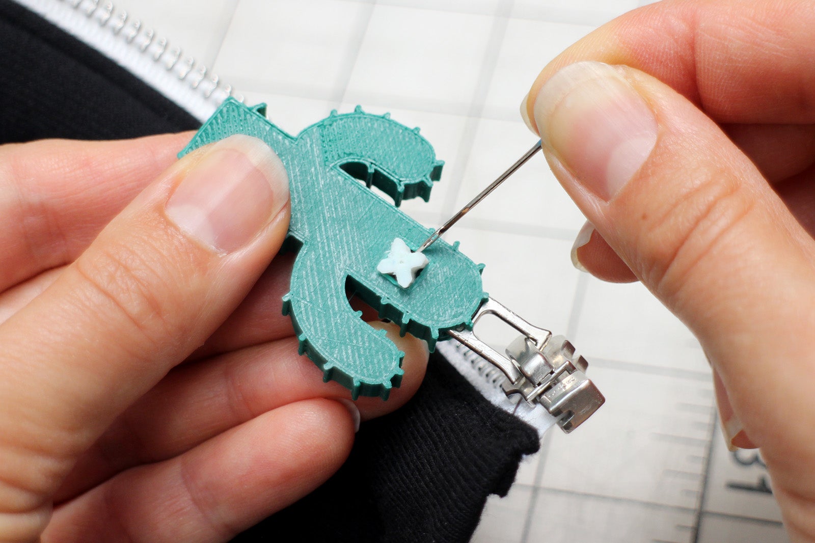 - If you're adding text or a relief pattern, make sure that it doesn't interfere with the metal zipper pull HOLE.