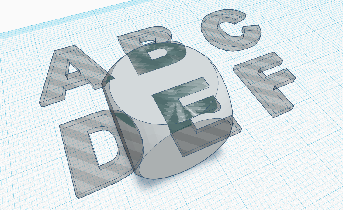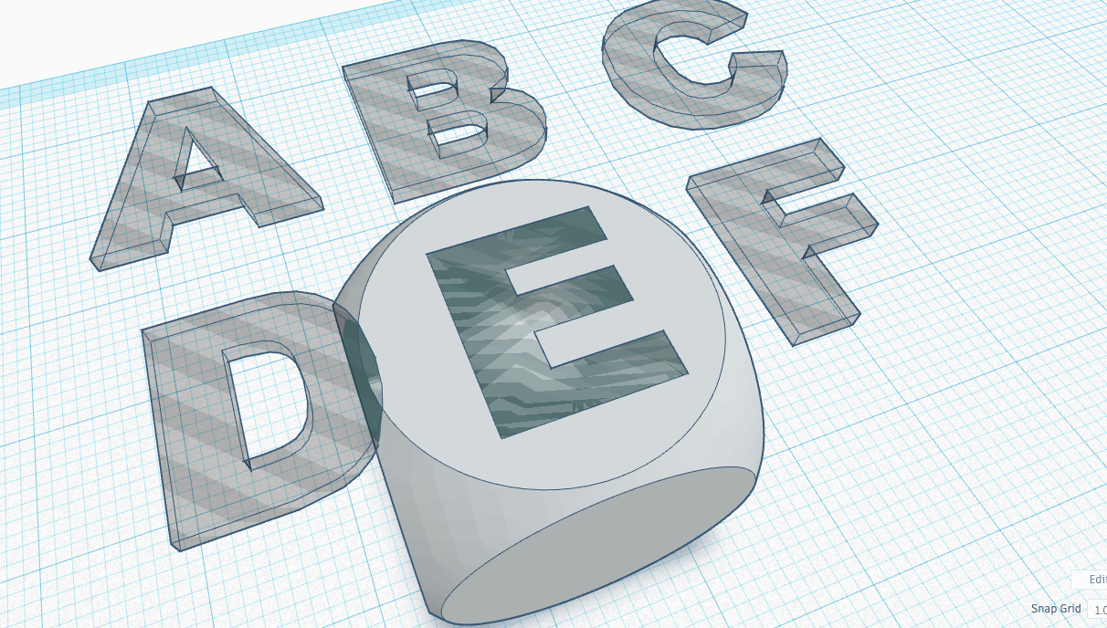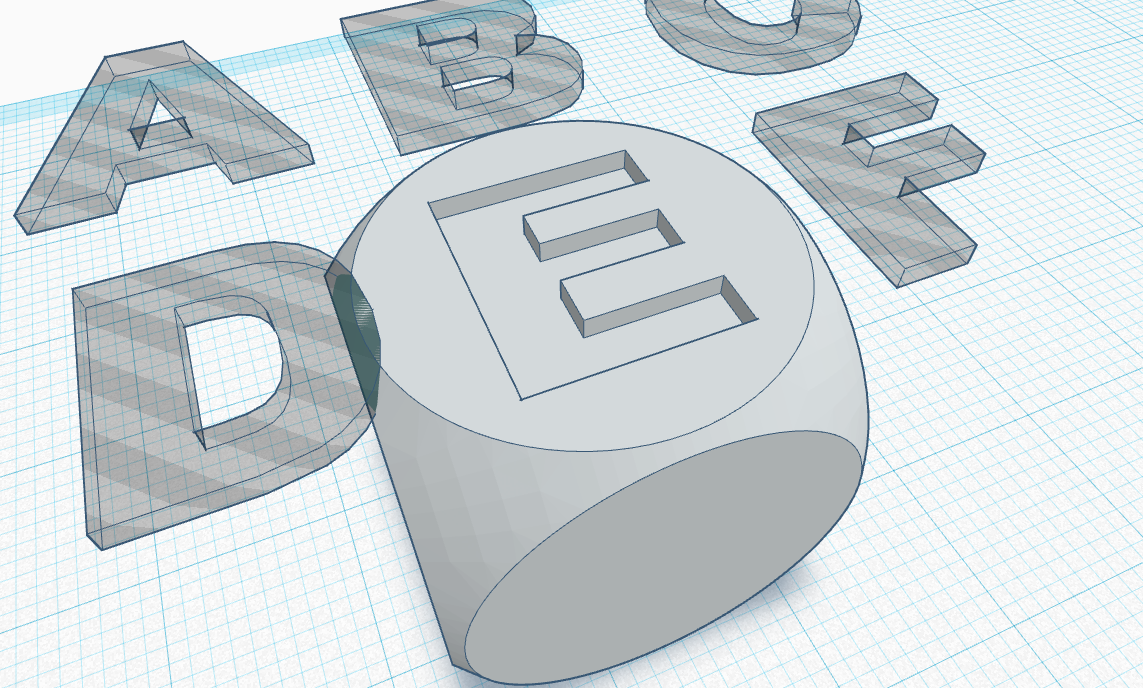 My daughter was playing with my husbands DnD dice and I thought it would be fun to make a set for her to play with! I thought she would have more interest in a set of dice with letters and pictures on them rather than normal dots, so this will show you how I've made my set along with the files to print your own. These are really easy to make using Tinkercad and I used JON-A-TRON's tutorial.