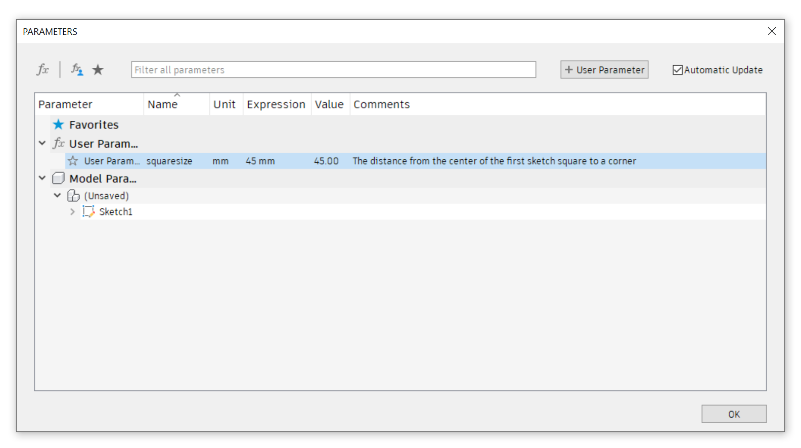 To access user parameters, go to Modify < Change Parameters < + User Parameter. Then, you can create your variable, define what units it will use, and specify a length, angle, etc.