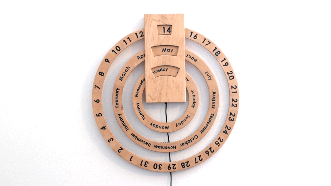 Years ago I came across a wooden perpetual calendar and I loved the idea. After thinking about it for months I decided I wanted to make one myself; however, there was a long list of things I wanted to do to improve on the idea. The most important change I wanted to make, is to automate the rings. I know me, and based on current wall calendars not showing the correct month for some time, if a daily change is necessary it would likely only be accurate a small percentage of the year.