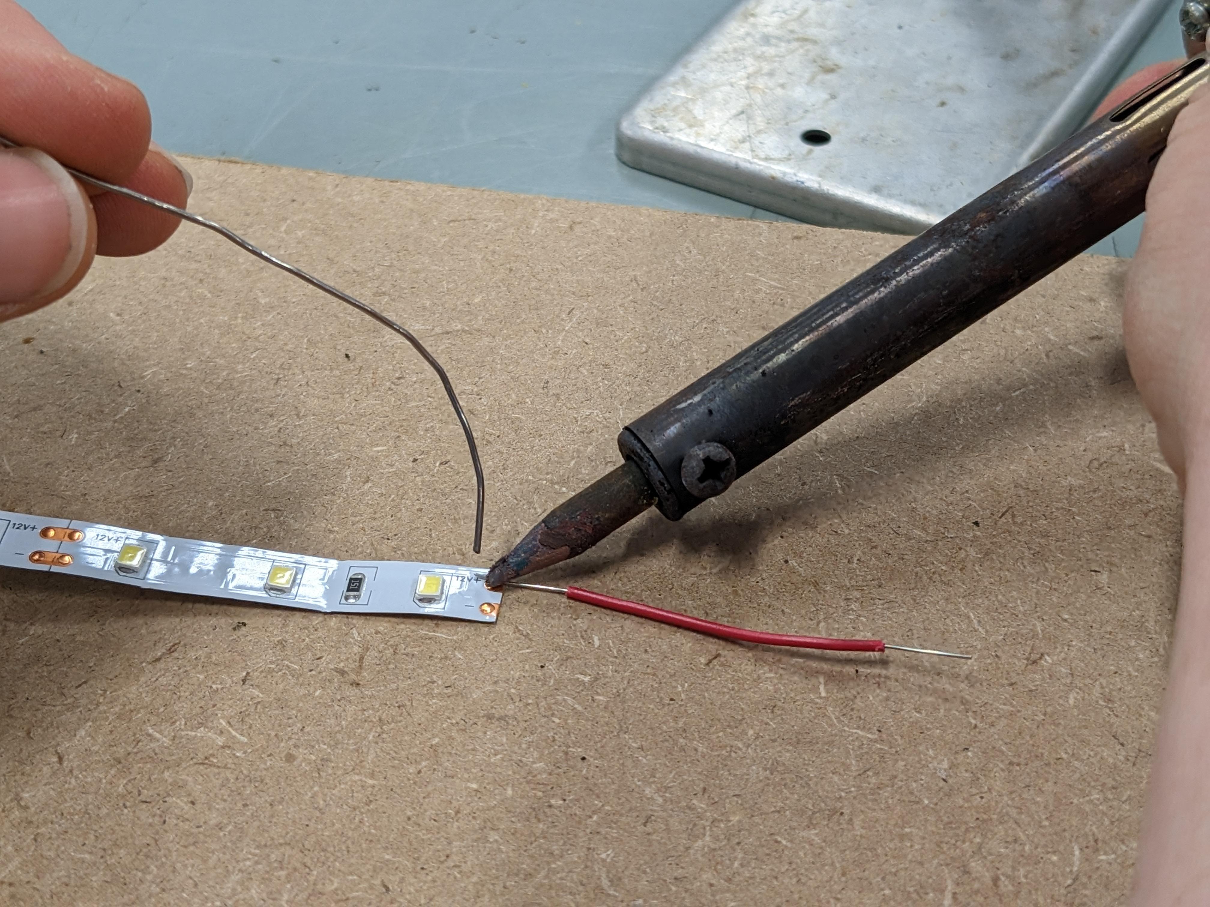 Figuring out a repeatable method for soldering the small connectors of the LED strips to the wire was the challenge. I ended up having the LED strip laid out on a scrap piece of MDF as I pressed the wire down on it with the tip of the soldering iron.