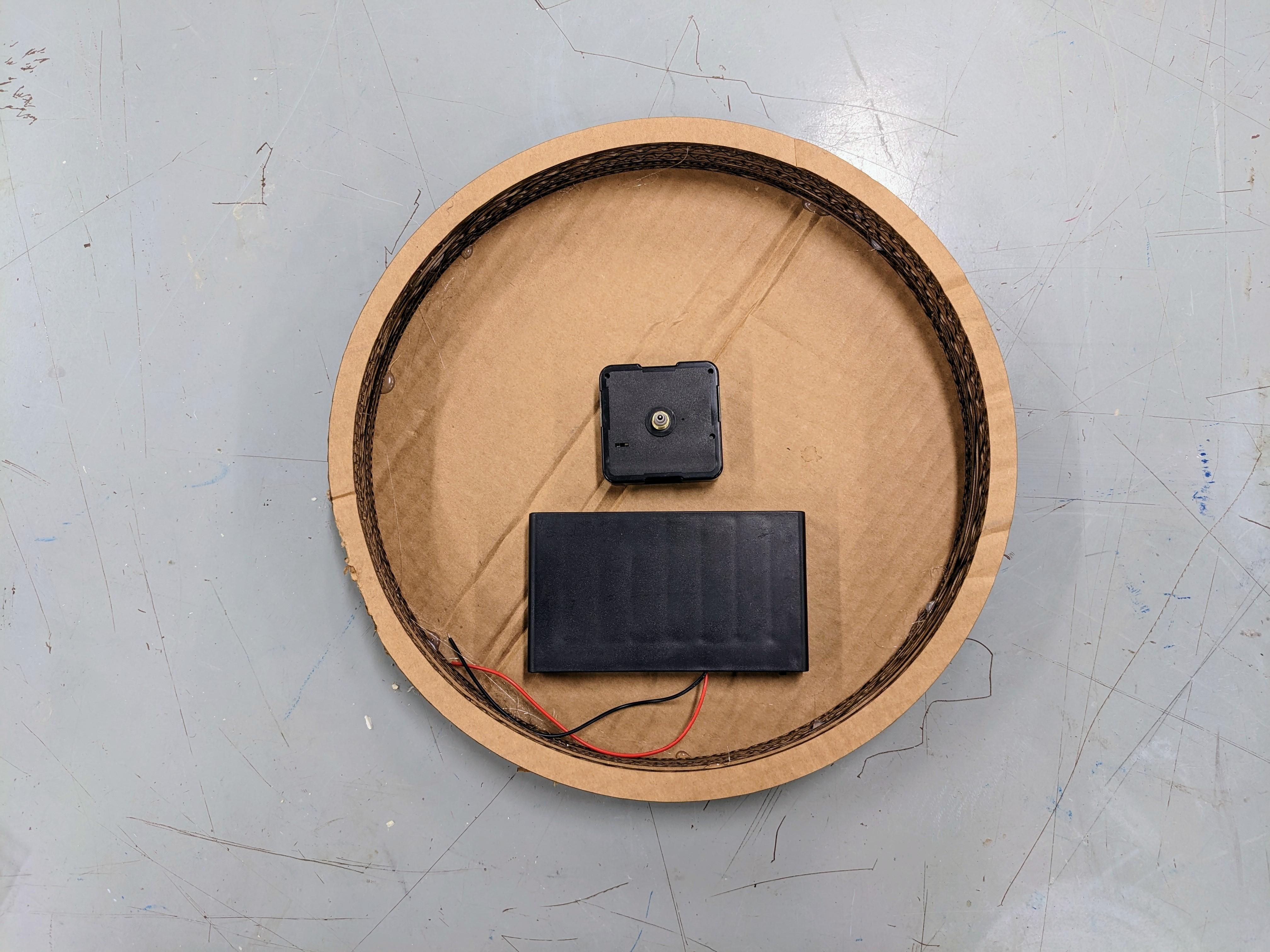 I always like to make an extremely cheap version of my designs before I move onto the more expensive material. In this case I used some corrugated cardboard to mock up the back of the clock and the two clock faces.