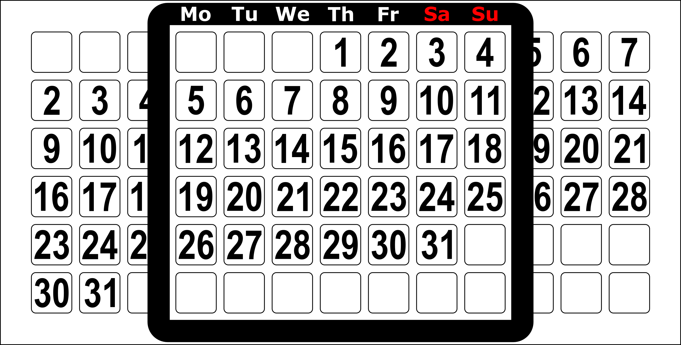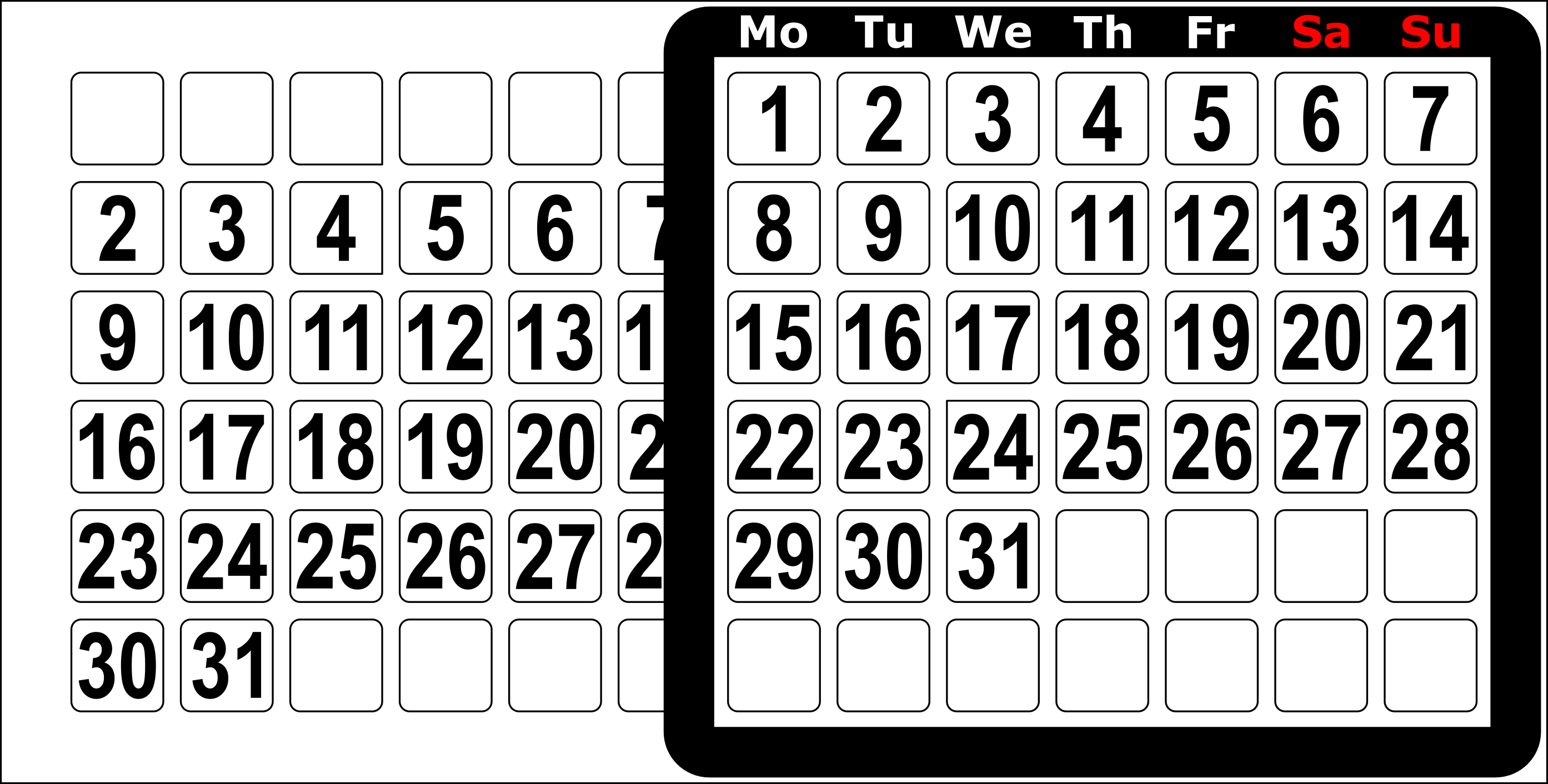 I attached below the SVG vector files, two variants, one with a black background and one with a white background. Notice that I also put the names of the months on the calendar, a logo that you can replace with your favorite logo, or motto, and some special signs that I plan to use in the future to signal important days like birthdays, holidays and so on.