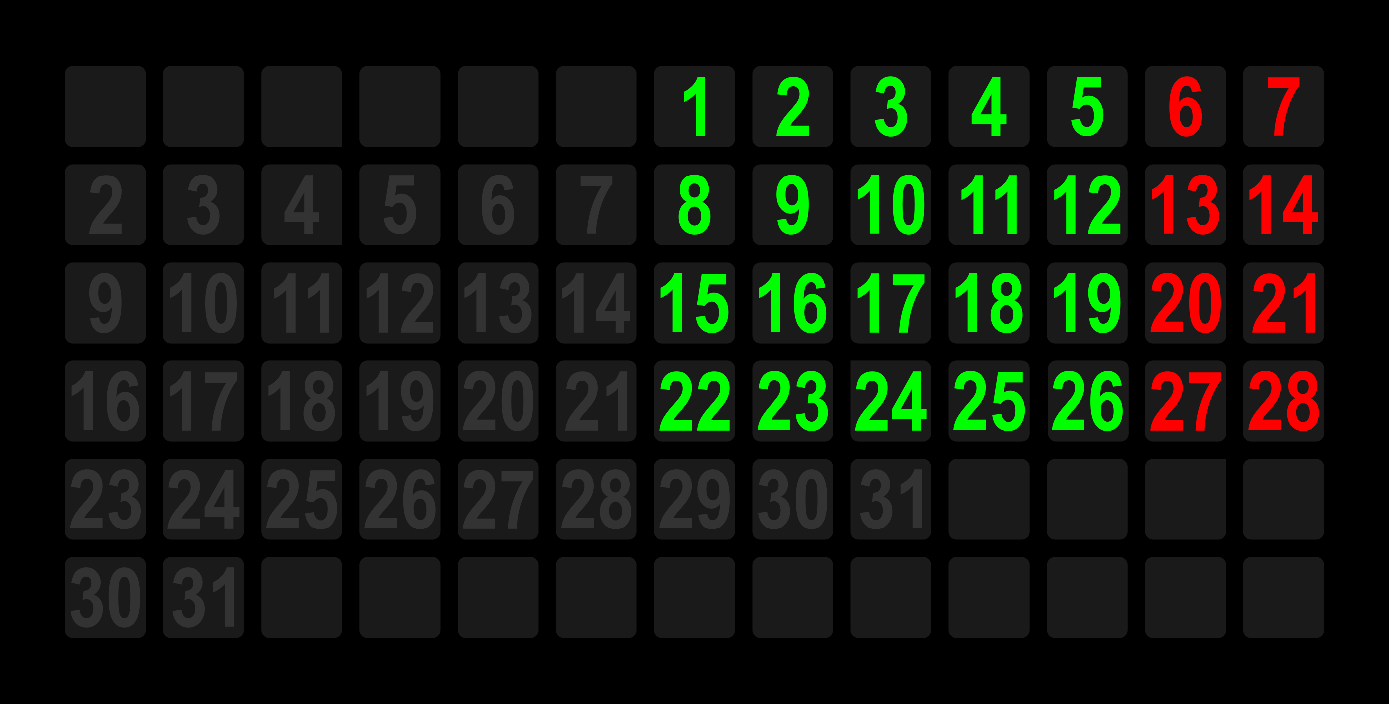 I did some simulations for different months in the future, you can see them in the video below, I think it shows quite well how the calendar works.