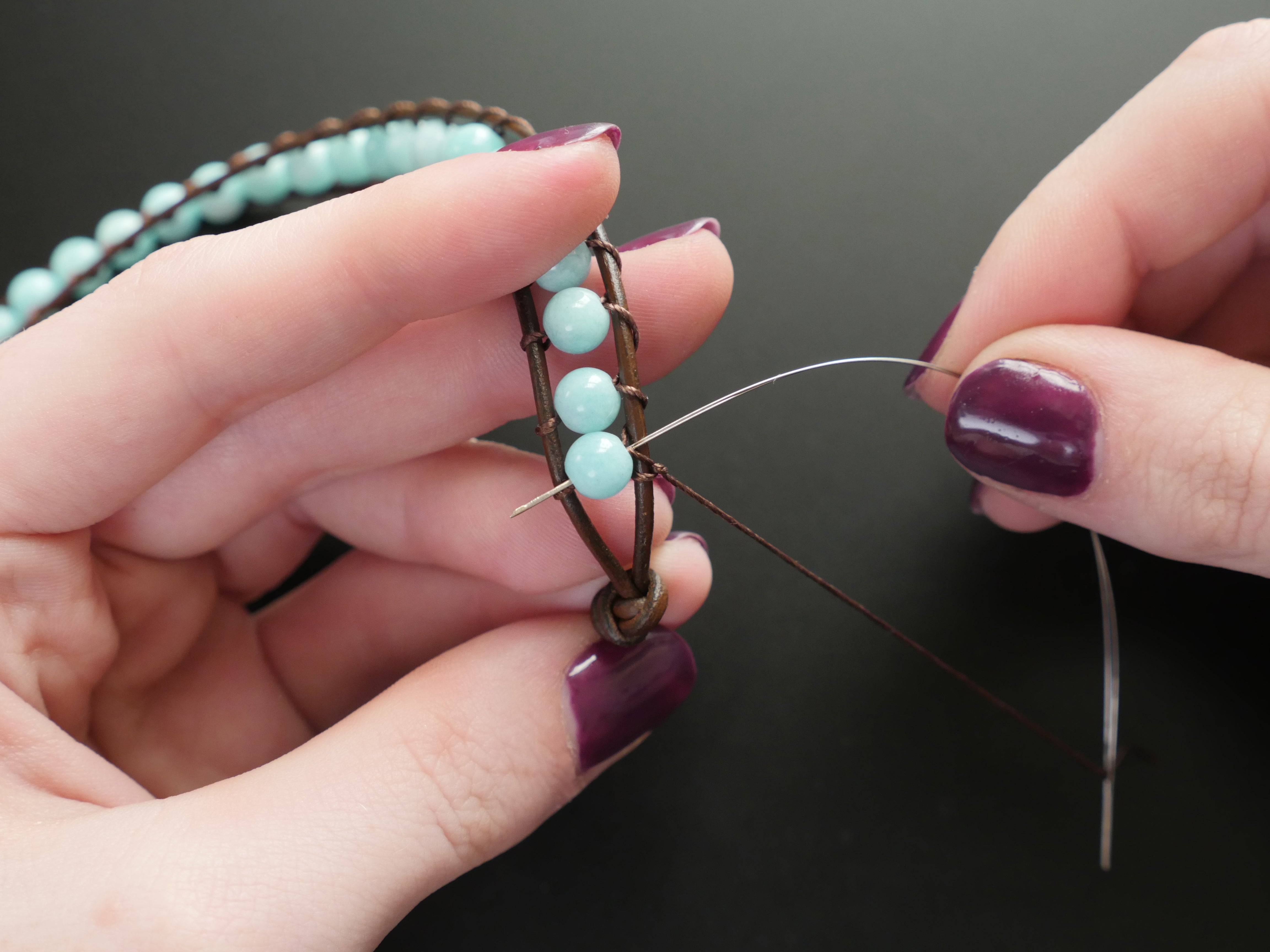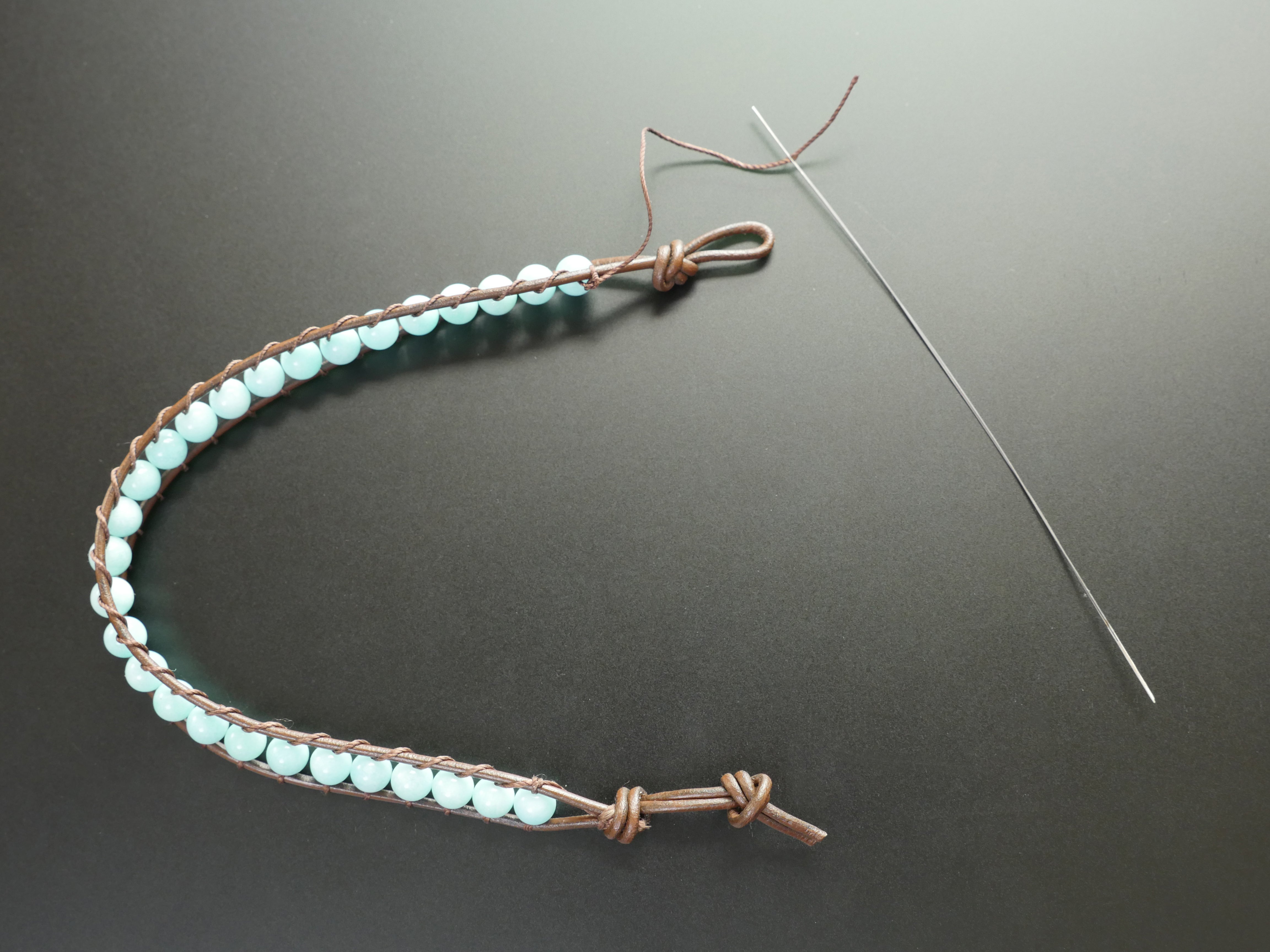 Thread the needle underneath the left cord and pull the beading cord all the way through until the bead is snugly secured between the two leather cords.