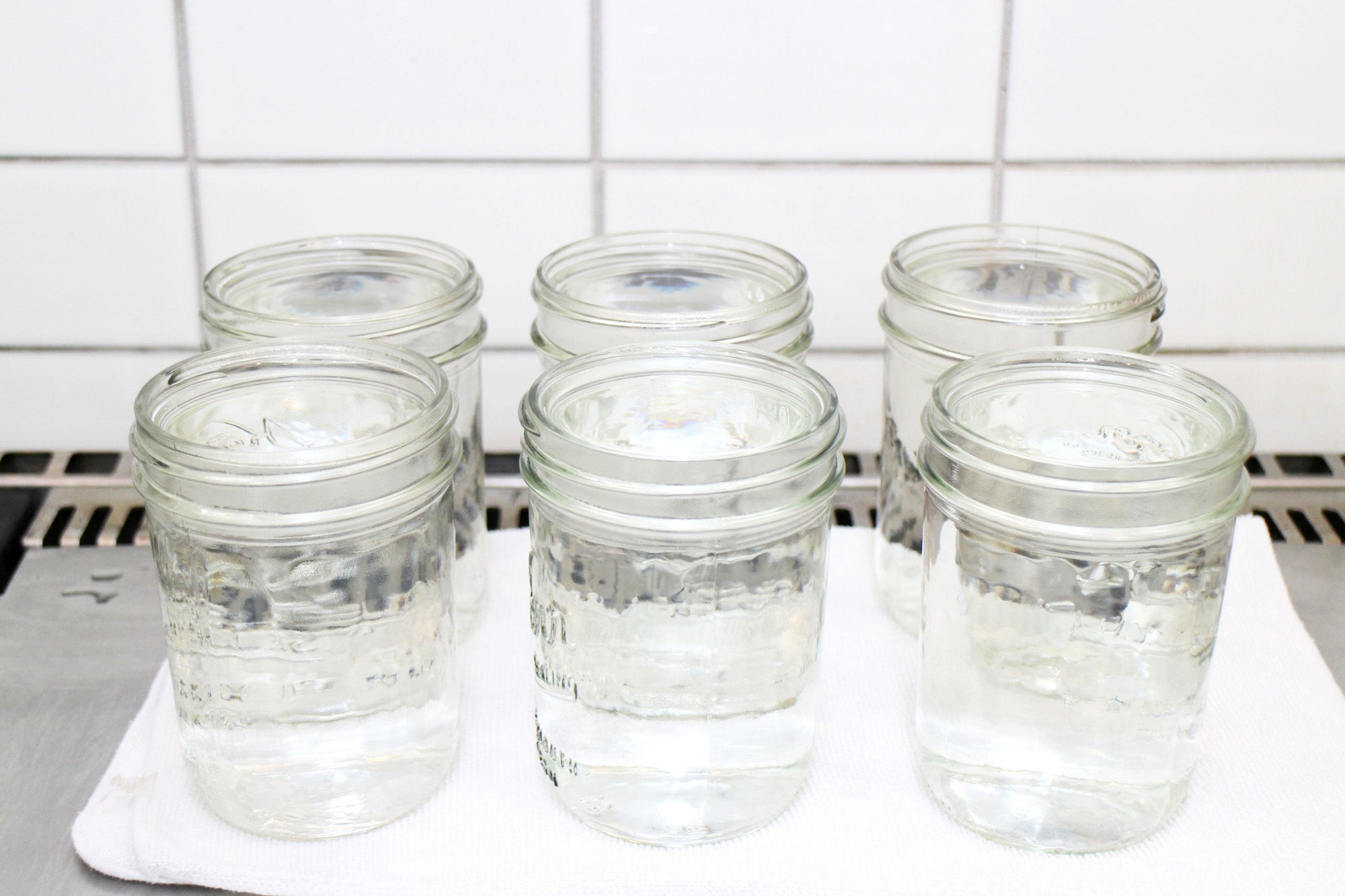 Once the timer goes off, use the jar lifter to remove the jars, still filled with water, and place them on a kitchen towel next to (but a safe distance from) the pot.