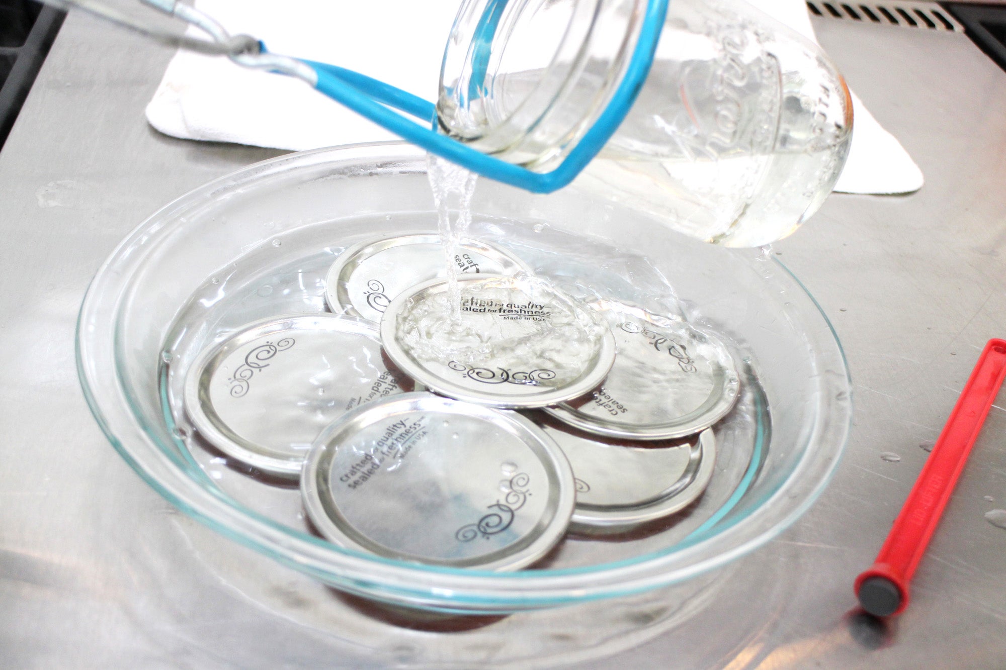 - shallow heat-proof bowl with the sealer lids spread out (unstacked) in it