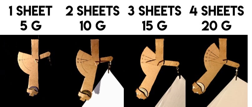 The paper sheets I have used are A4 sheets (21 cm x 29.7 cm, or 1/16 m^2), and they have a grammage of 80g/m^2. So one single A4 sheet has a weight of 5 grams (80/16=5), and I have used this reference to calibrate the weighing scale as shown below.