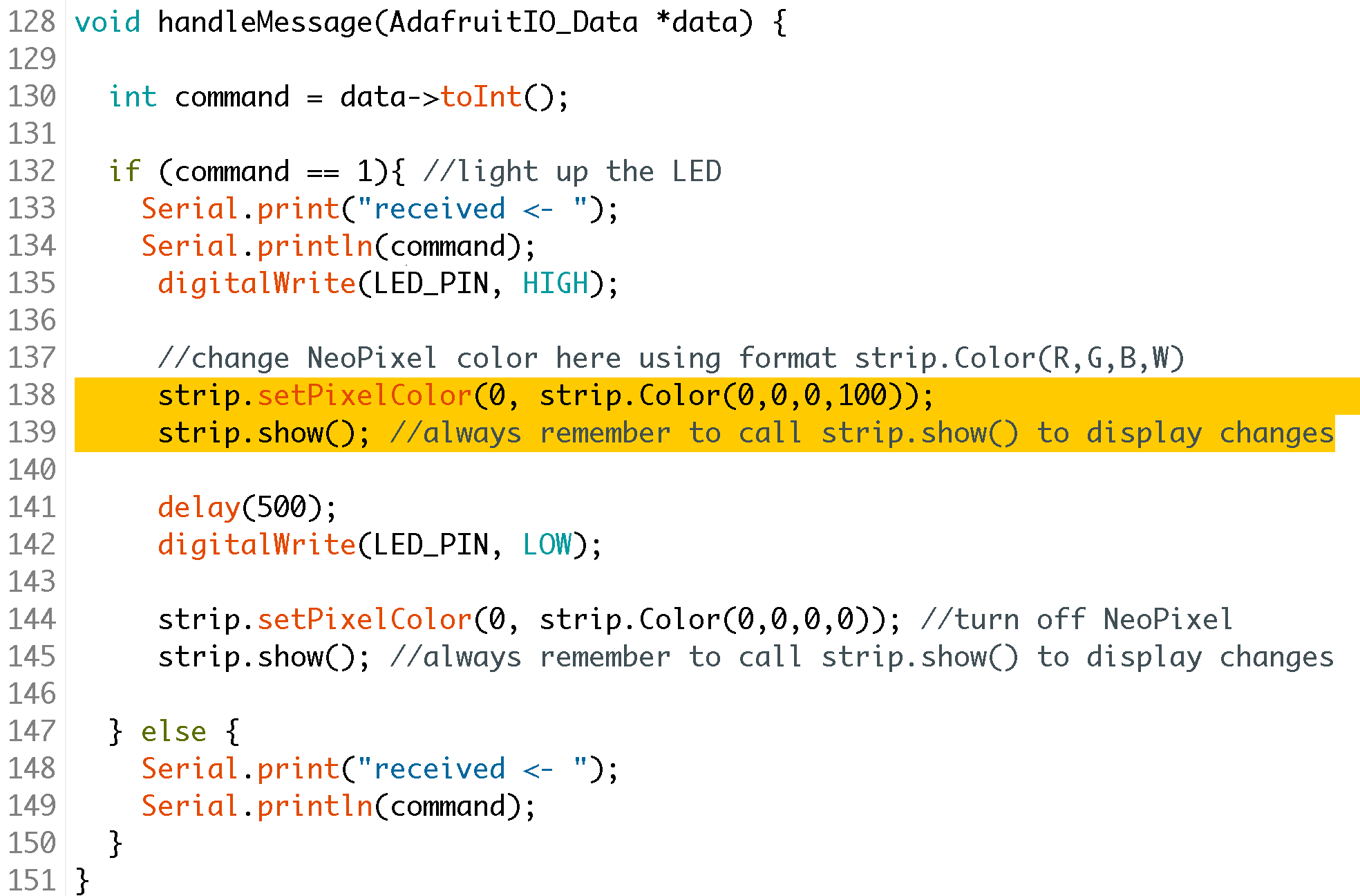 Don't forget to add another strip.setPixelColor(); and strip.show(); to turn the pixel off when the LED goes LOW (lines 144 and 145 in the screenshot above).