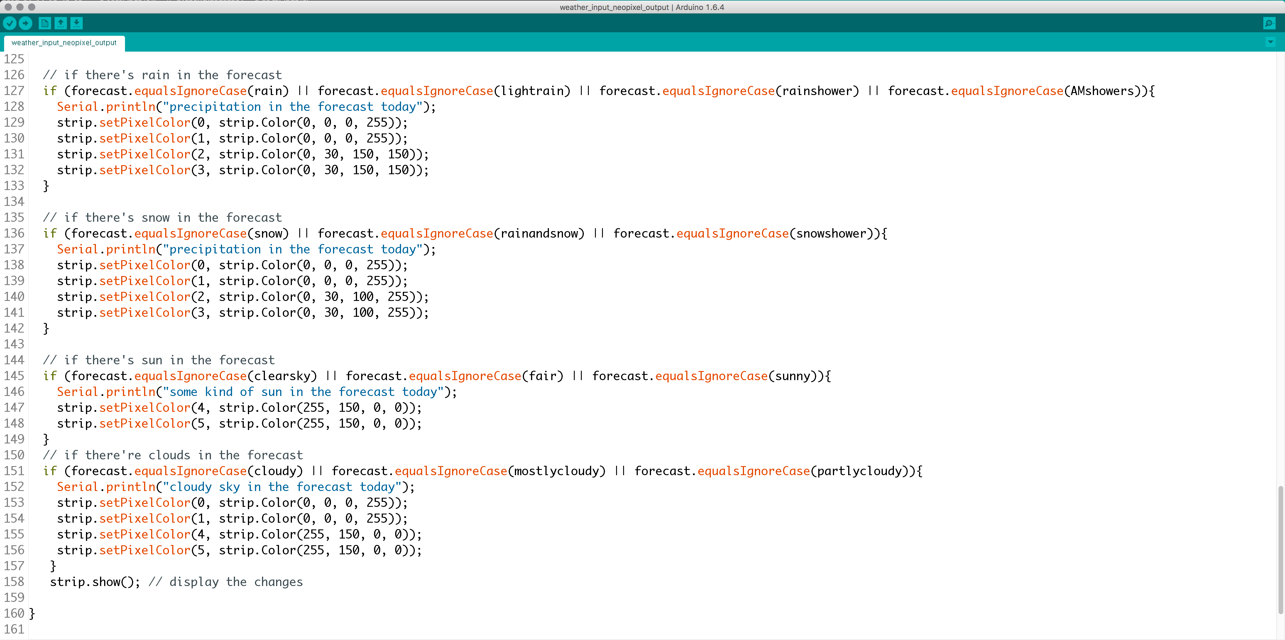 This statement compares the feed data stored in the forecast string against the rainy terms we defined moments ago. Using the or || comparison operator lets us add multiple conditions to the same if statement, grouping several rainy conditions into the same blue and white NeoPixel output.
