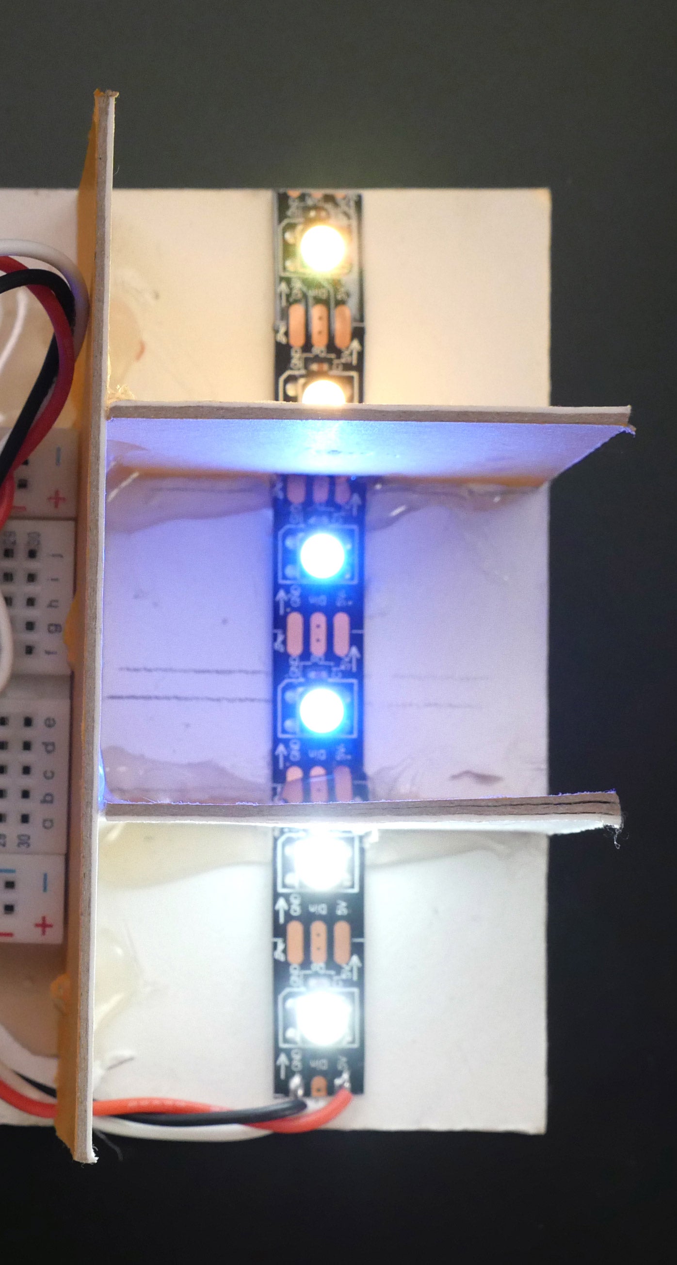 To mock up a weather display, let's make the pixels illuminate some symbols. One of the simplest and best ways to diffuse LEDs is to give them space, so build a small cardboard enclosure that has some depth to it. Add more cardboard walls to divide the pixels into chambers (I'm using three chambers of two pixels each). A piece of plain white printer paper taped to the openings of the chambers provides the "screen," and glueing on another layer of cut paper creates shadowy outlines of whatever shapes you choose.