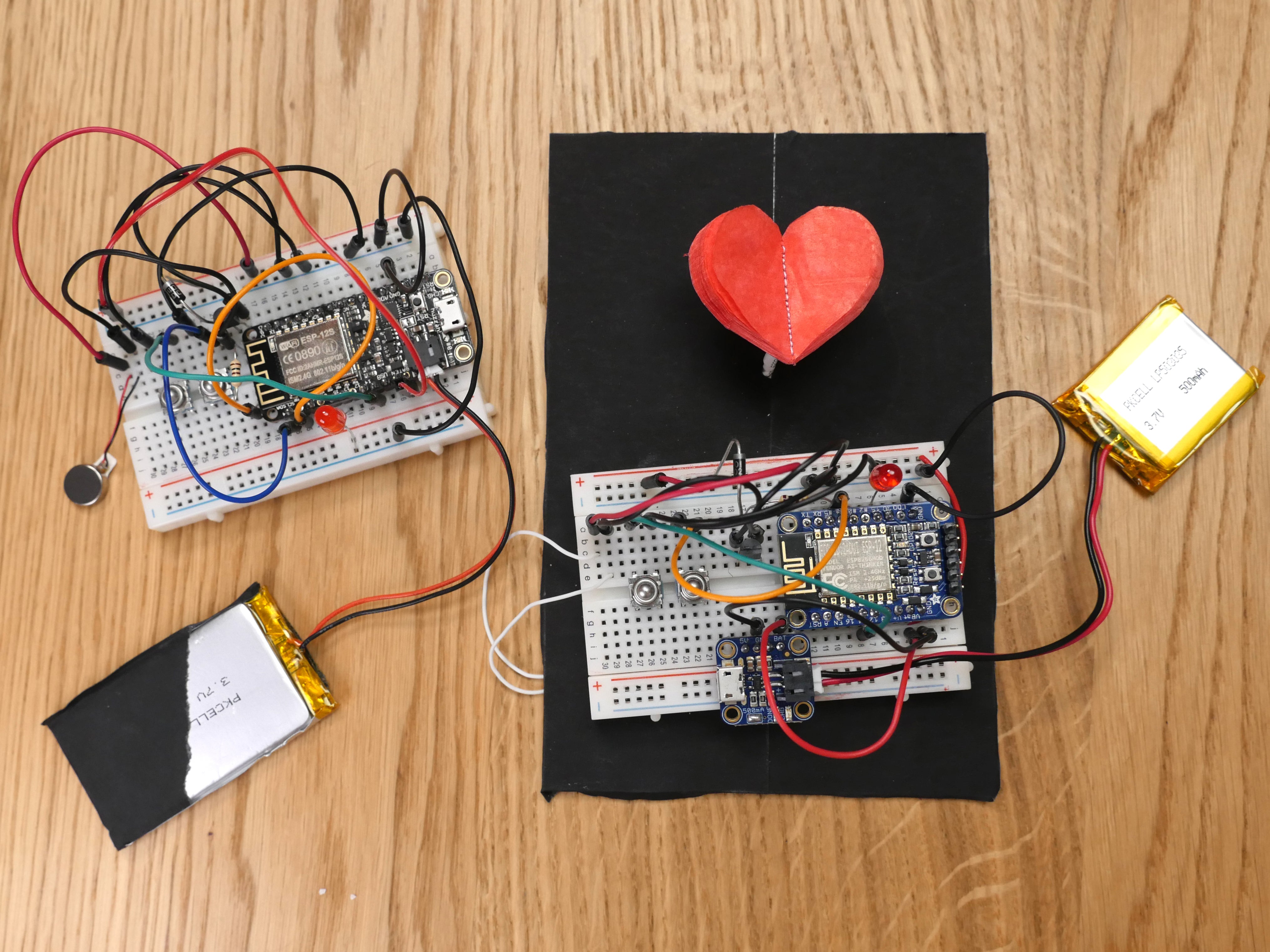 Let's go through one more example to cement your new knowledge. In some cases, you may find your project needs to both trigger internet action and displays internet data. This lesson combines techniques we've learned in earlier lessons to make a pair of devices that communicate with one another. This is also a great example to base your project on if you want to trigger an internet action and display some feedback about that action, whether on the same device or another. We'll use the Internet Valentine project as a case study throughout the lesson, which flashes the LED and buzzes the pager motor on both devices when buttons on either one are pressed.