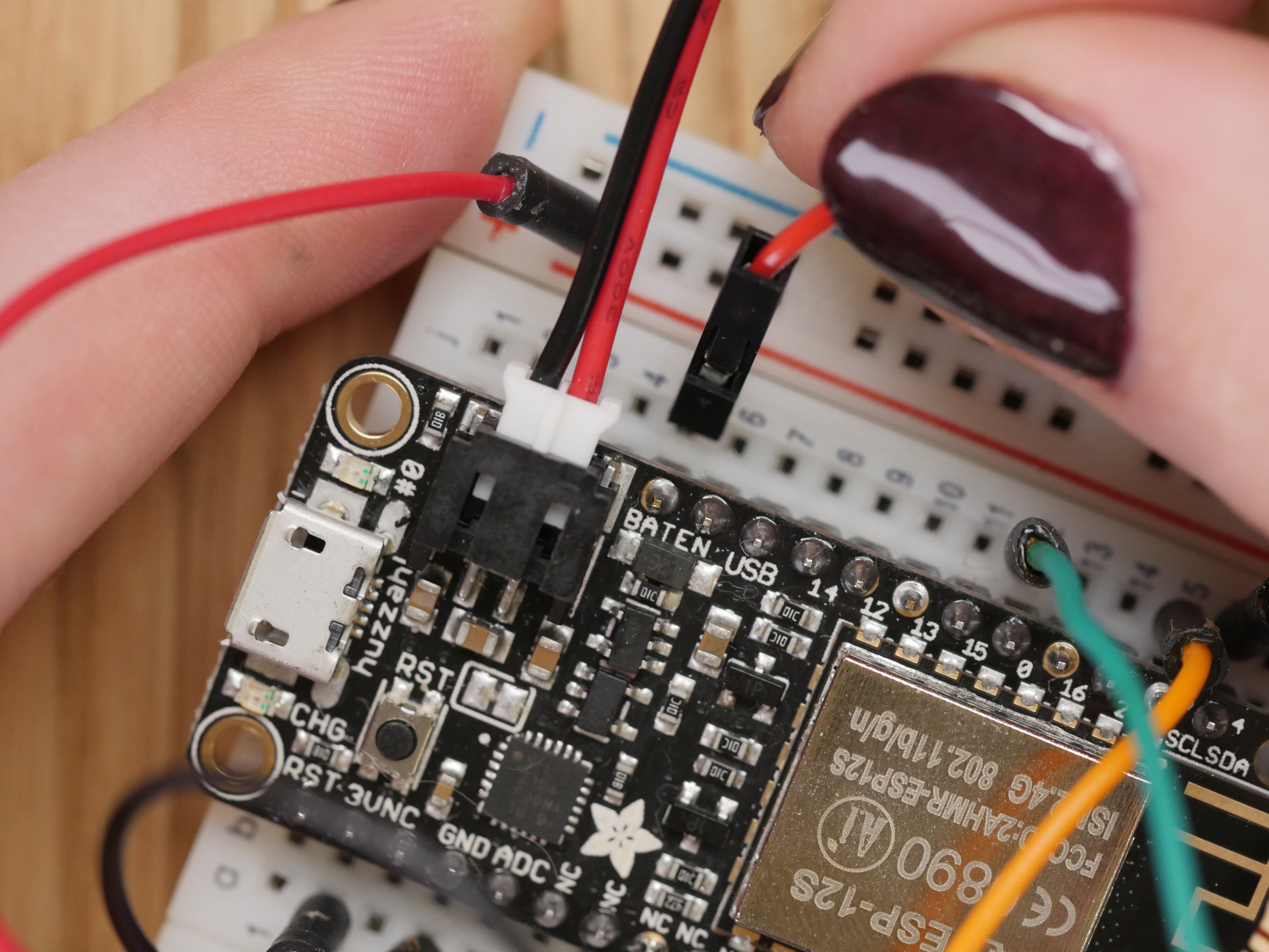 Power the boards via USB or with LiPoly batteries (adjust position of power wire between USB and BAT accordingly, if you are using it for something like NeoPixels, a motor, etc.).