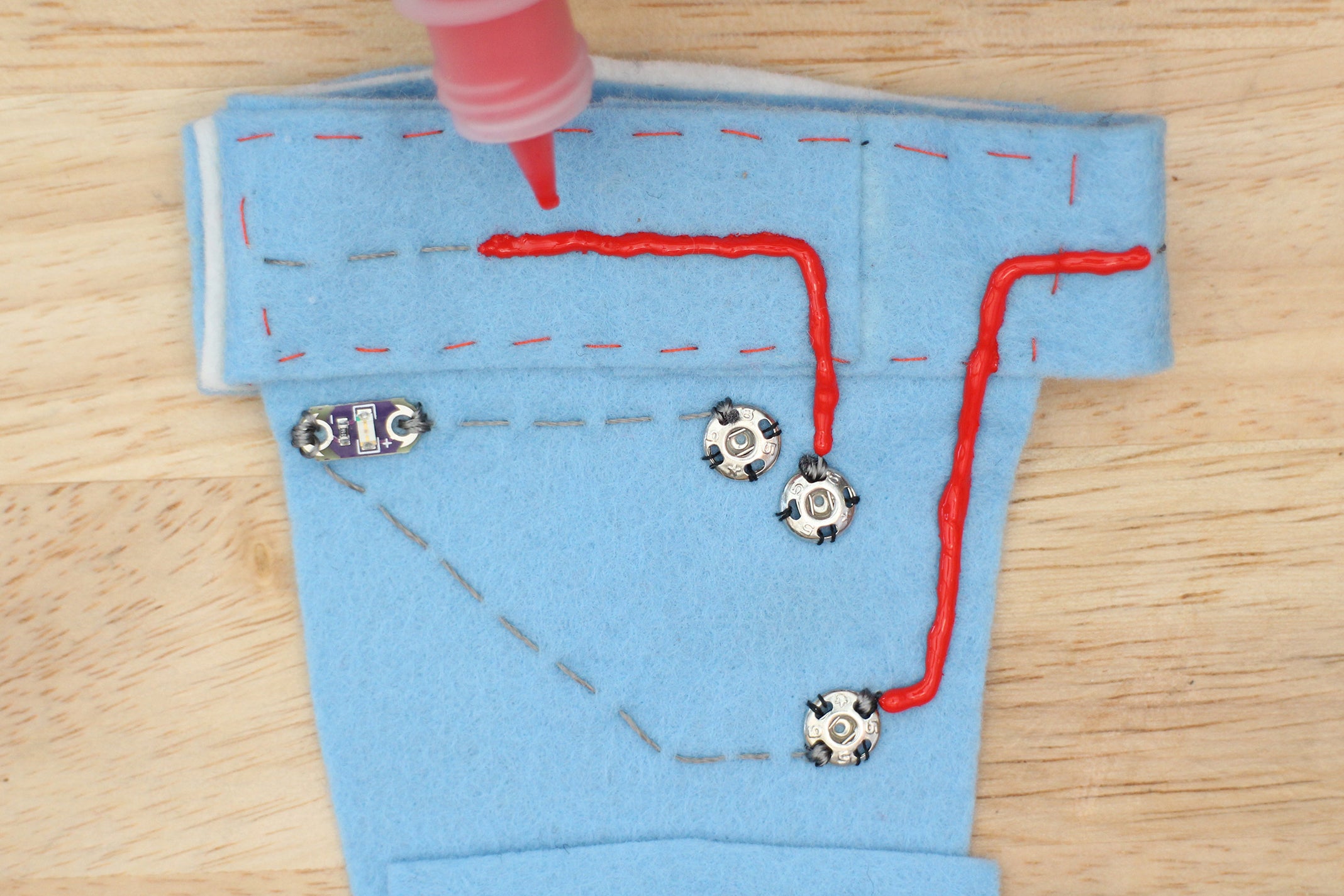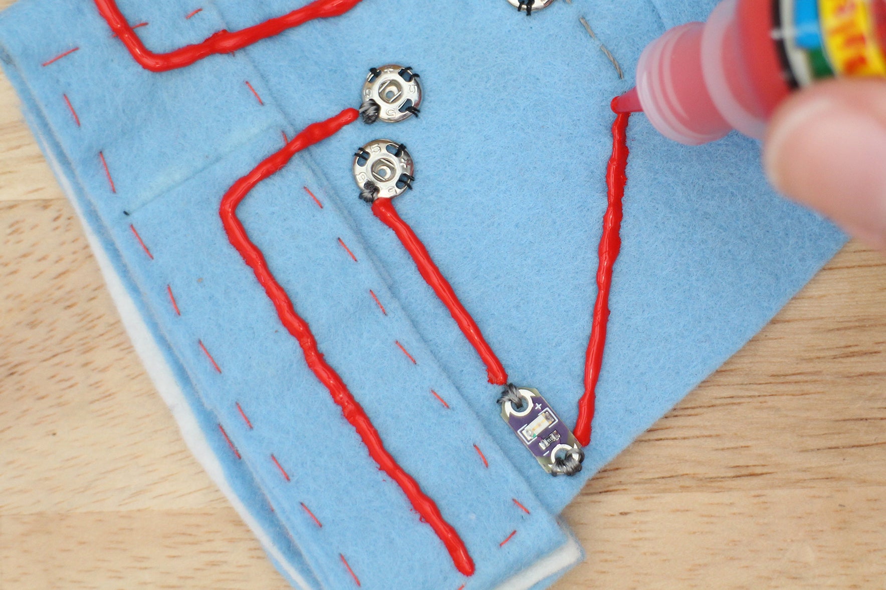 You have now covered the front of the circuit, but when using conductive thread you also need to address the back of the circuit where the stitches may have poked through. At this point, the knots are already covered with glue, but if any stitches broke out to the other side you may need to cover those.