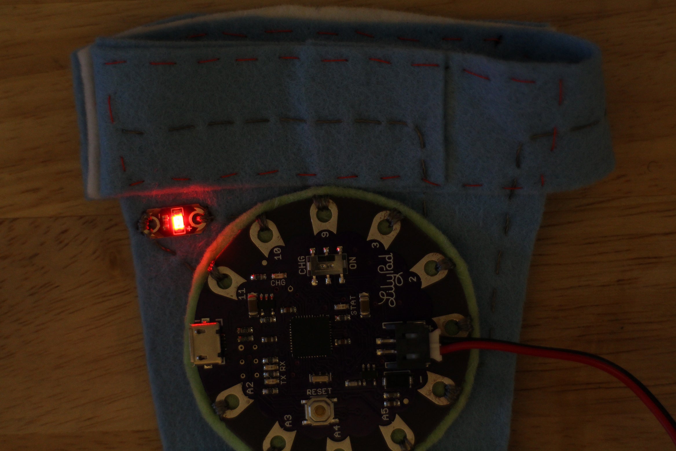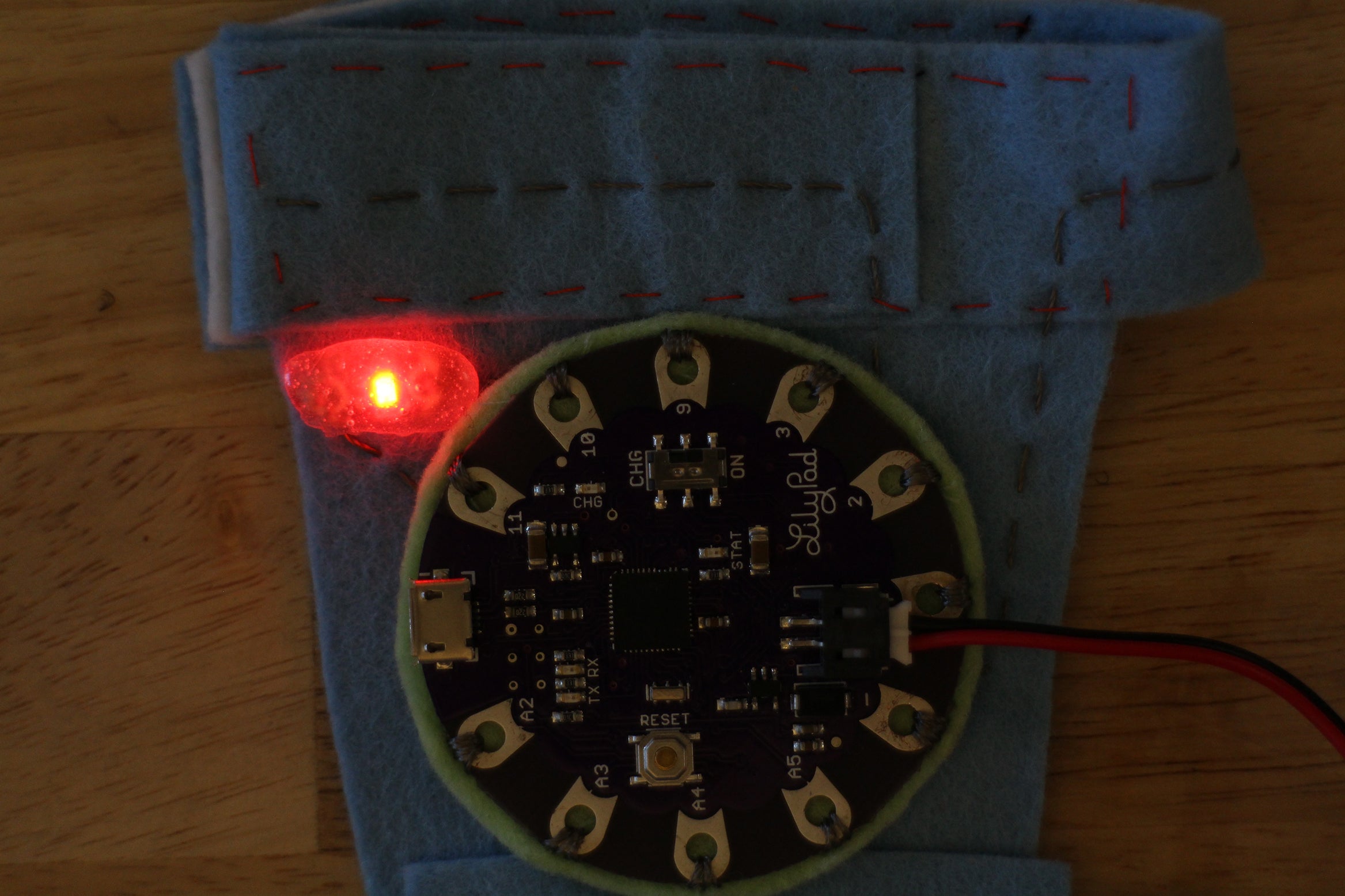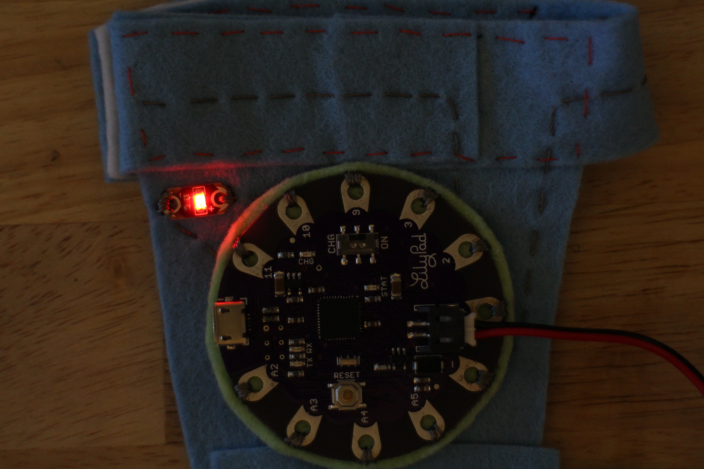 Remember to always test after a step of progress has been made! Snap the LilyPad USB on and plug the battery in. Put the mitt on and push the power switch to ON. Give some high-fives to test to see if everything is still working.
