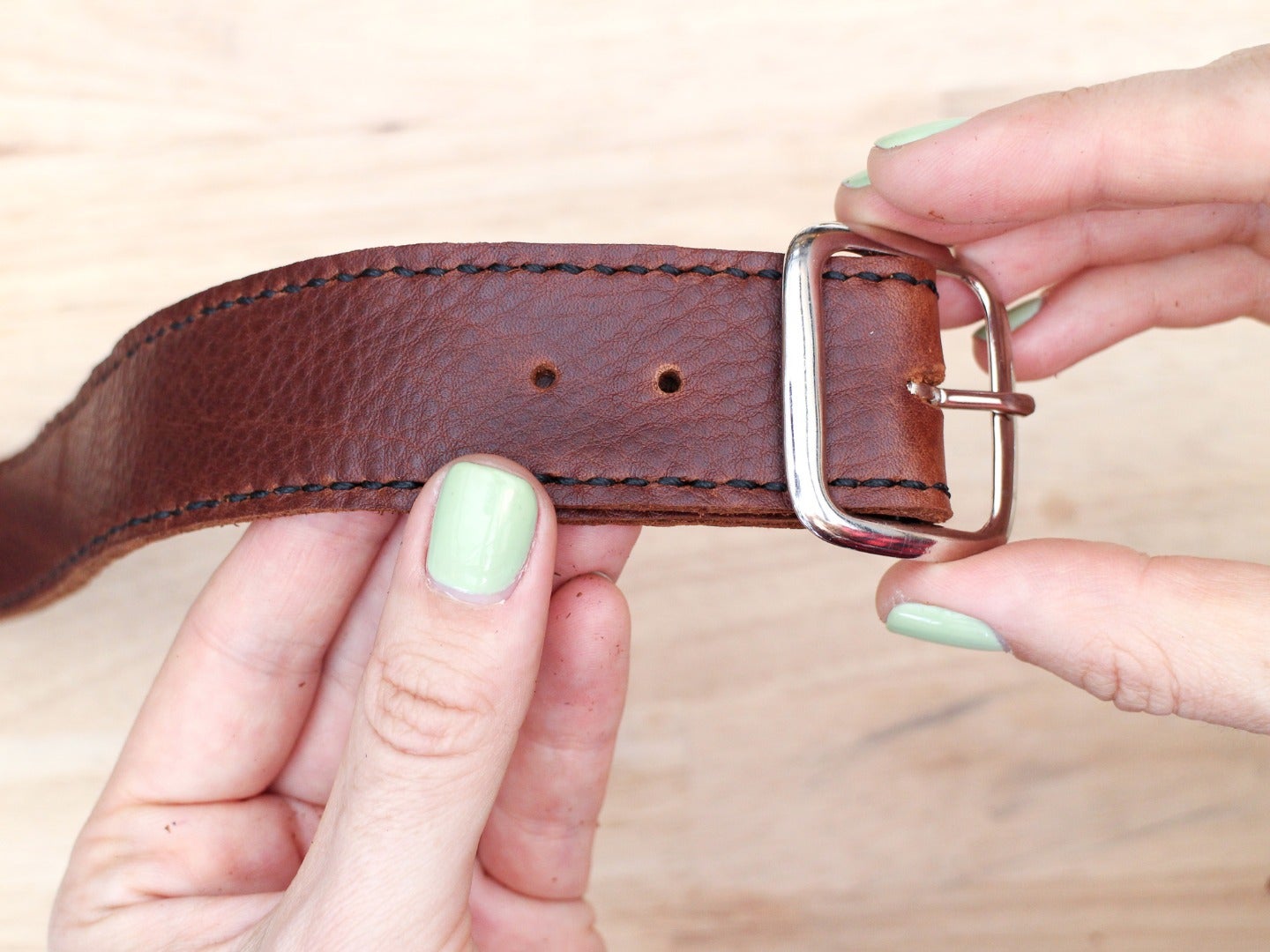 Add a buckle, snap or other closure to your strap or belt in the same way you would if it was a single layer. Just be sure to never punch through your stitch lines when you are adding hardware.