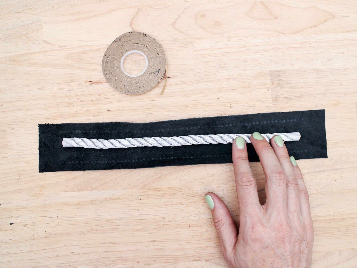 Use some double sided tape to stick your rope core down the center of the strip on the flesh side.