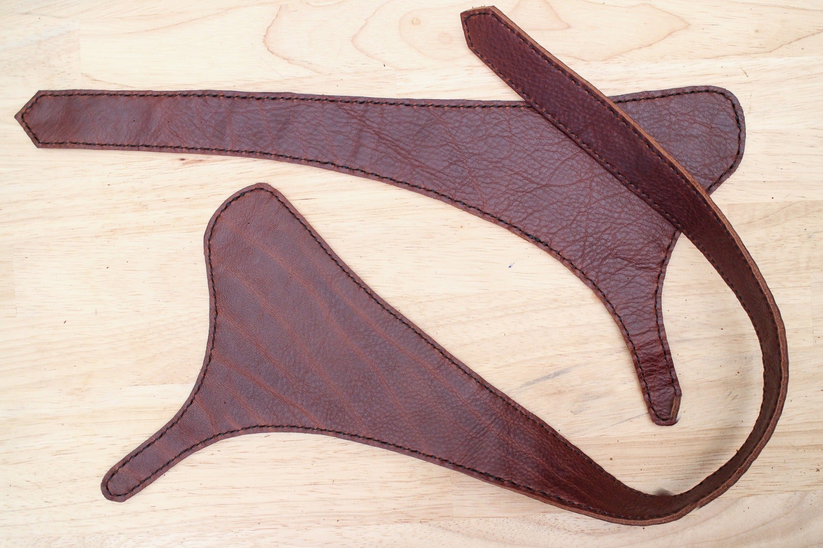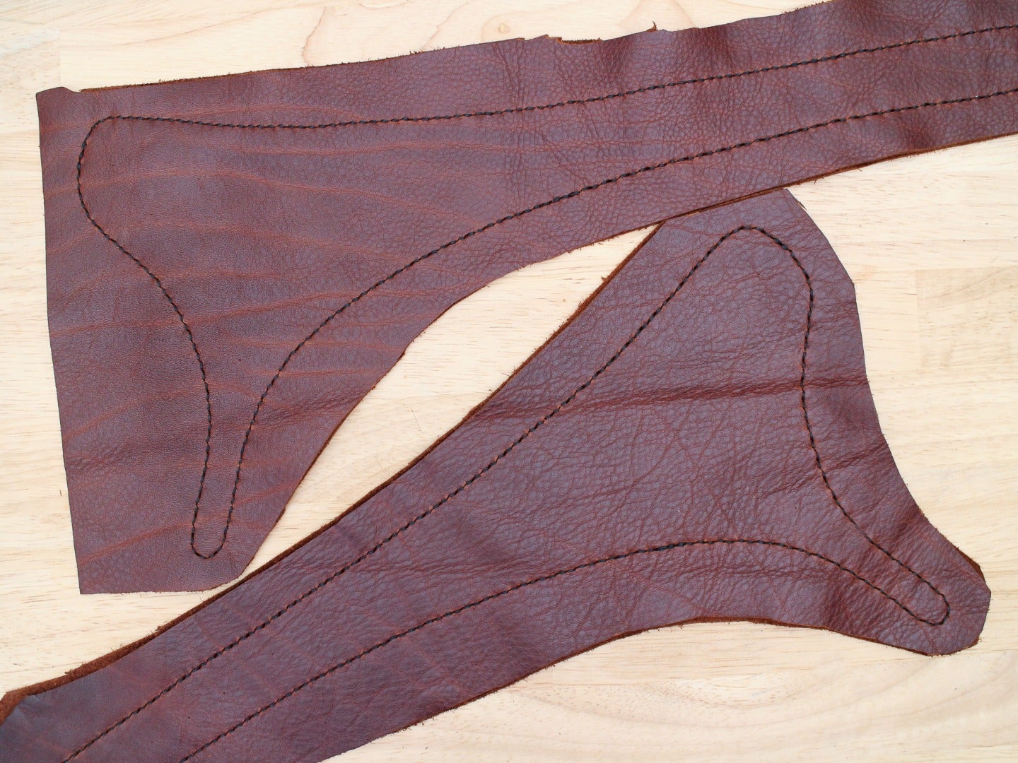 Double layer shoulder straps are basically made the same way we made the double layer belt in the last lesson. Two layers of thinner leather are sewn together to create a reinforced strap with grain on both sides. To create the pattern, just follow the same measurements you used to create a single layer shoulder strap, but laminate two layers of thinner leather to create each strap.