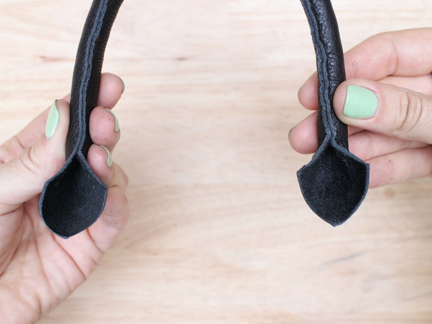 This kind of strap or handle is made by sewing a piece of leather around a core made out of a rope or cord. To attach the handle, you need to create shaped ends on the strap that will be sewn or riveted directly onto the bag, or onto a ring. Designing the shape of these ends can add a distinct style to your design.