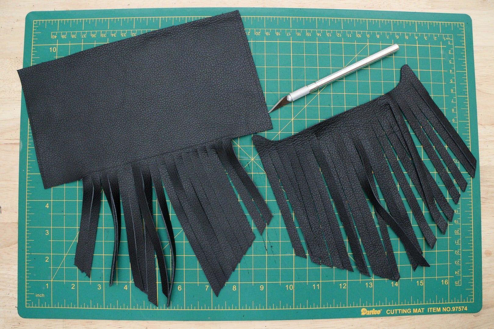 When I had both pieces cut out, I used a metal ruler and an x-acto knife to cut the fringe following the marks I had made with my awl on the leather.
