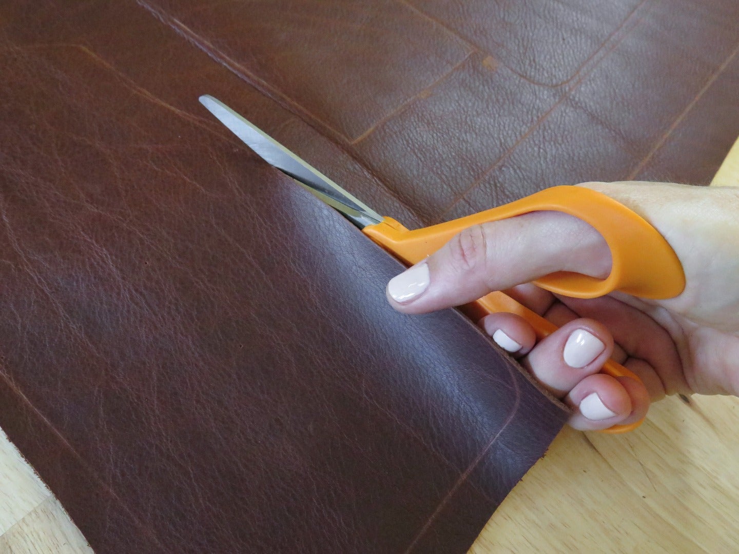 Keep your scissors at a right angle to your leather and cutting surface, this helps you create a cut edge that is squared off, not beveled.