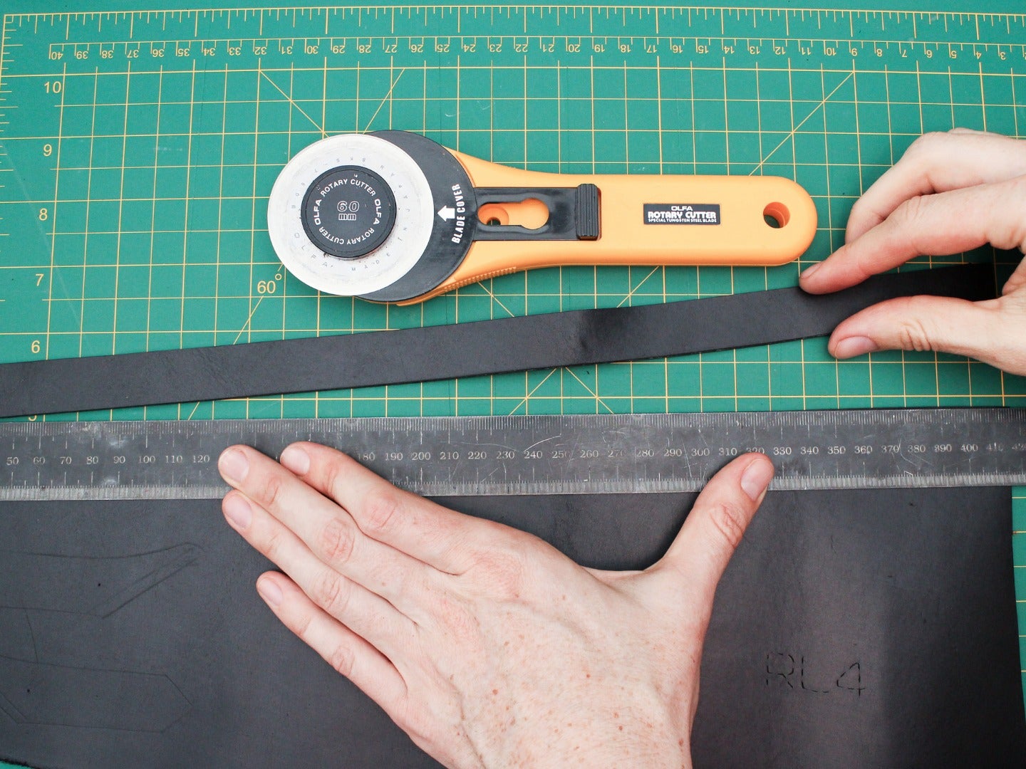 Hold your leather steady with one hand while pulling your knife smoothly along your marked pattern lines with the other.