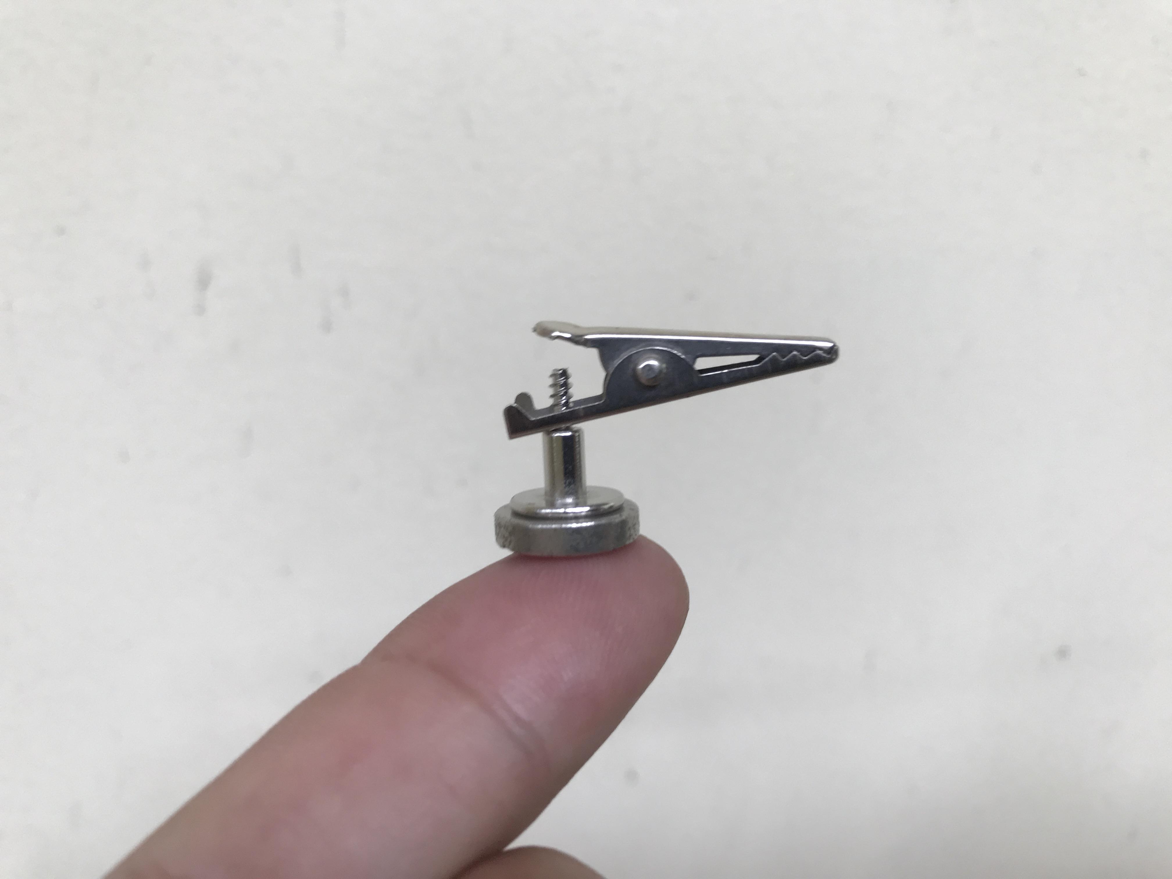 Firstly, I found a screw that could be fitted into the alligator clip hole and tightened it. This screw has a flat surface, round shape with a diameter roughly the same as a magnet.