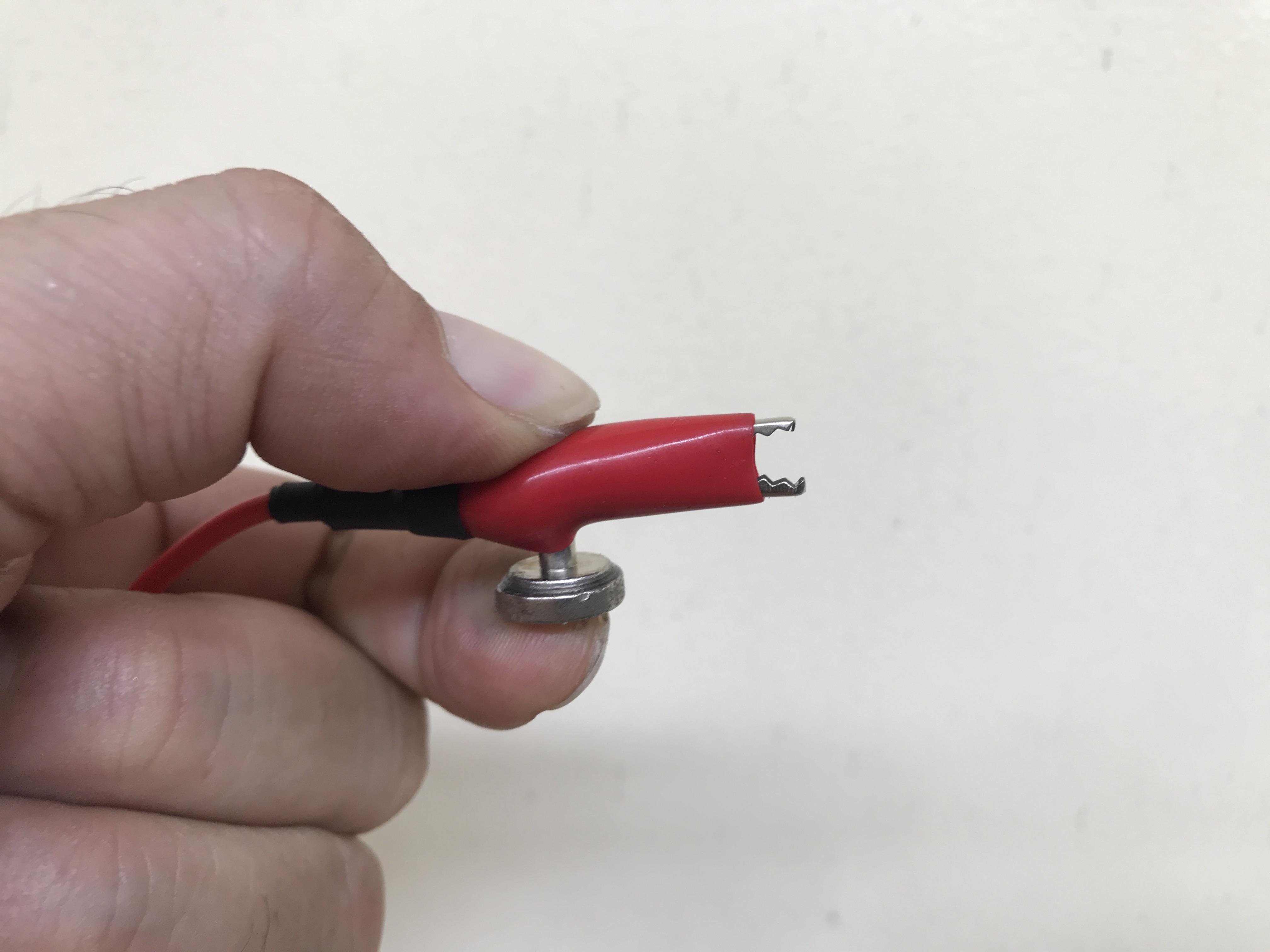 I soldered this alligator clip to the red wire and covered it. Since neodymium magnets can lose their magnetic ability due to soldering, I had to carefully glue a magnet onto the screw head using super 502 glue. Note that this may cause an electrical insulation between screw surface and magnet.