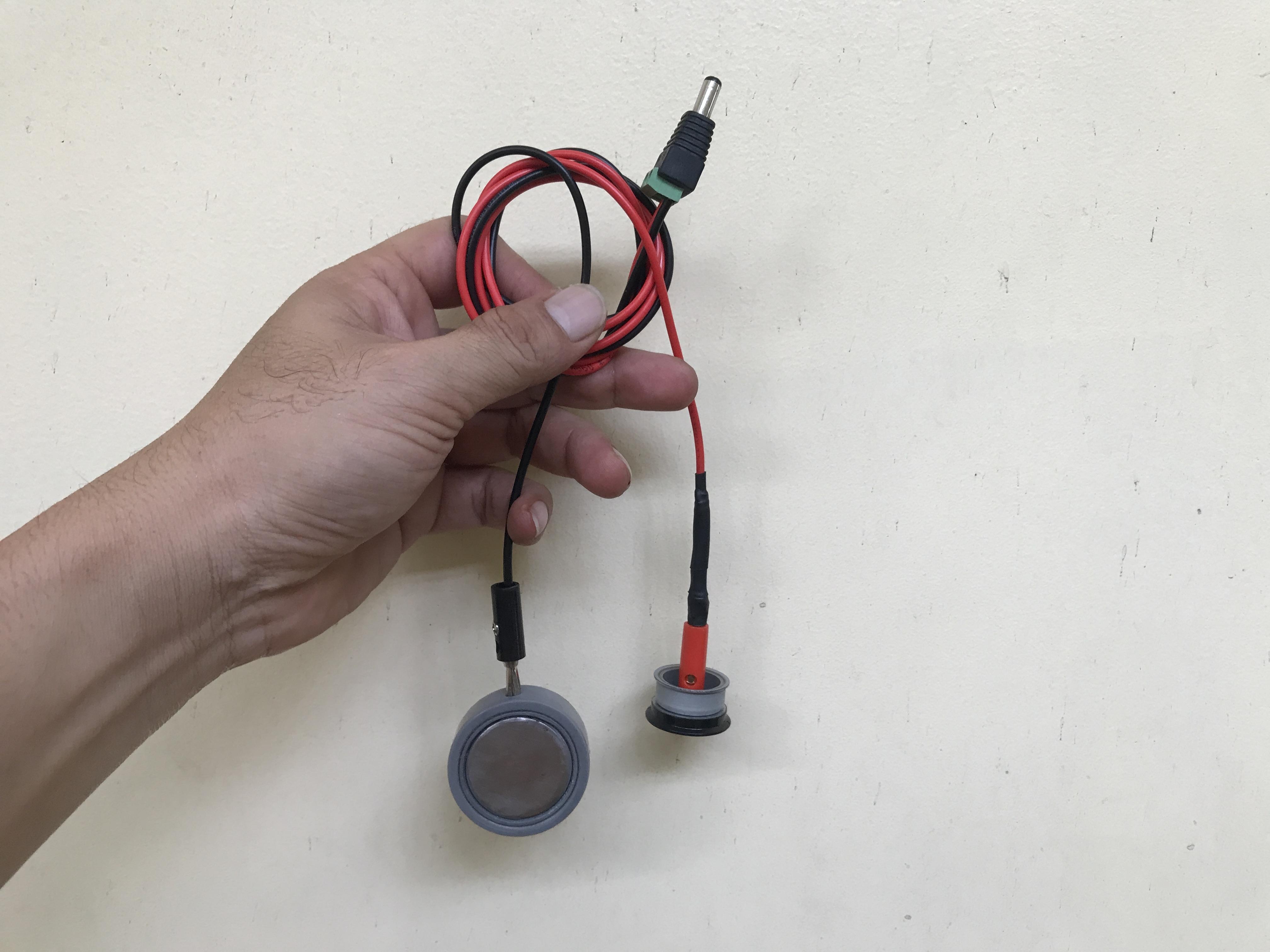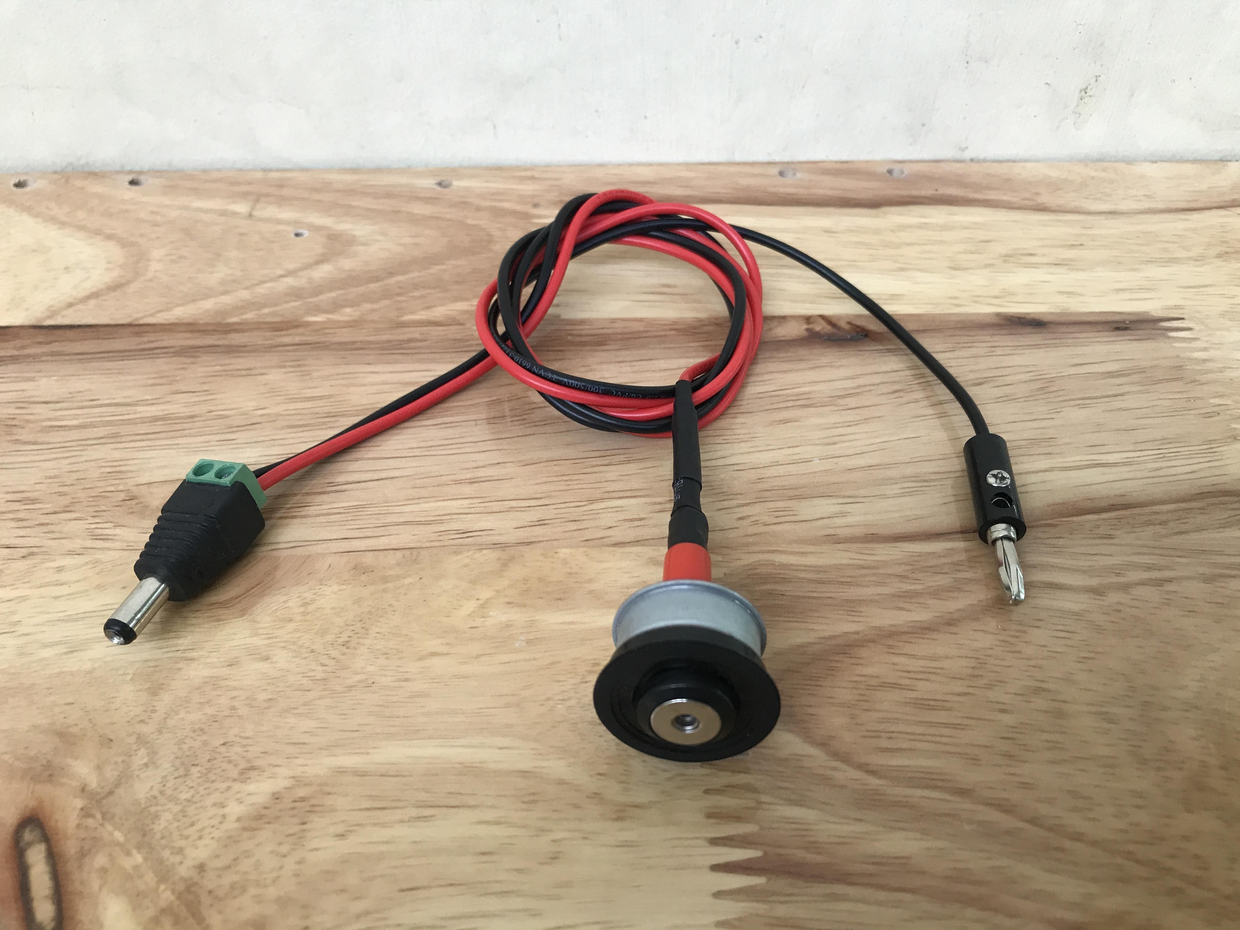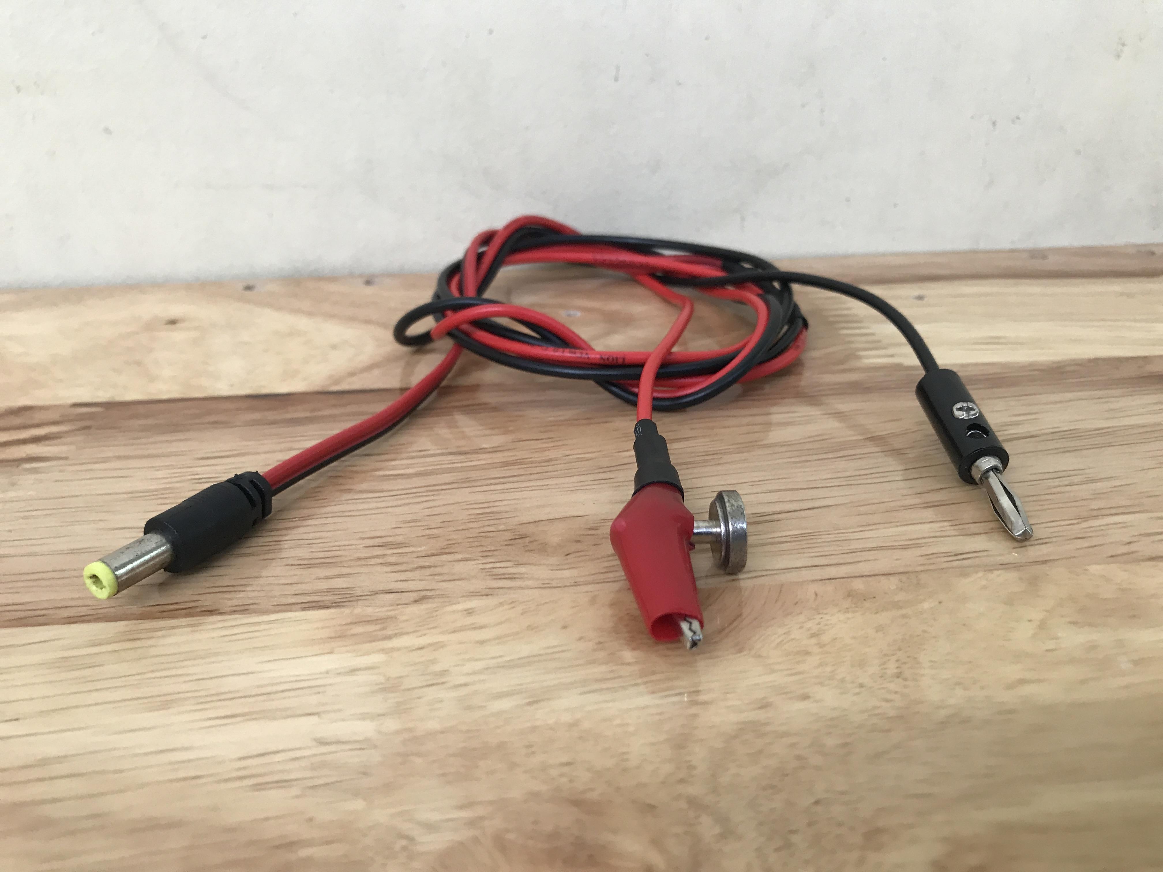 A black wire was connected to another banana connector on one end. At the other ends, two wires were connected to a DC power male plug.