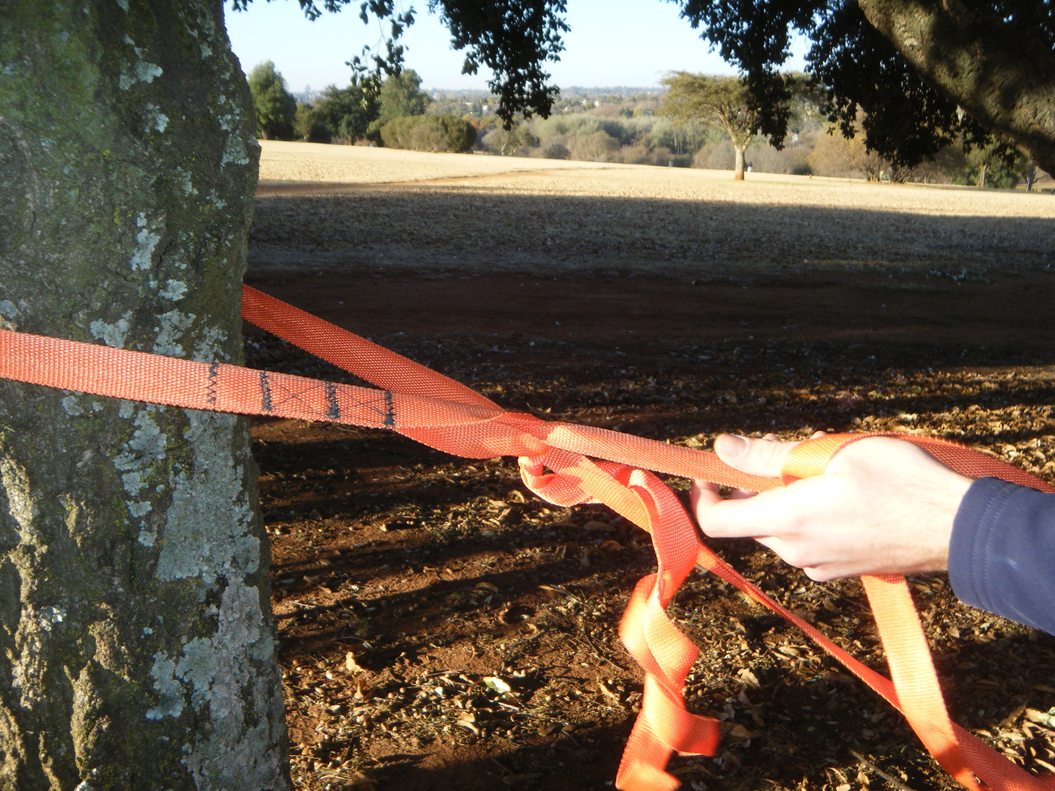 - Send tree straps around two trees (spaced adequatly apart) and through their loops so you have a tail coming from each tree.