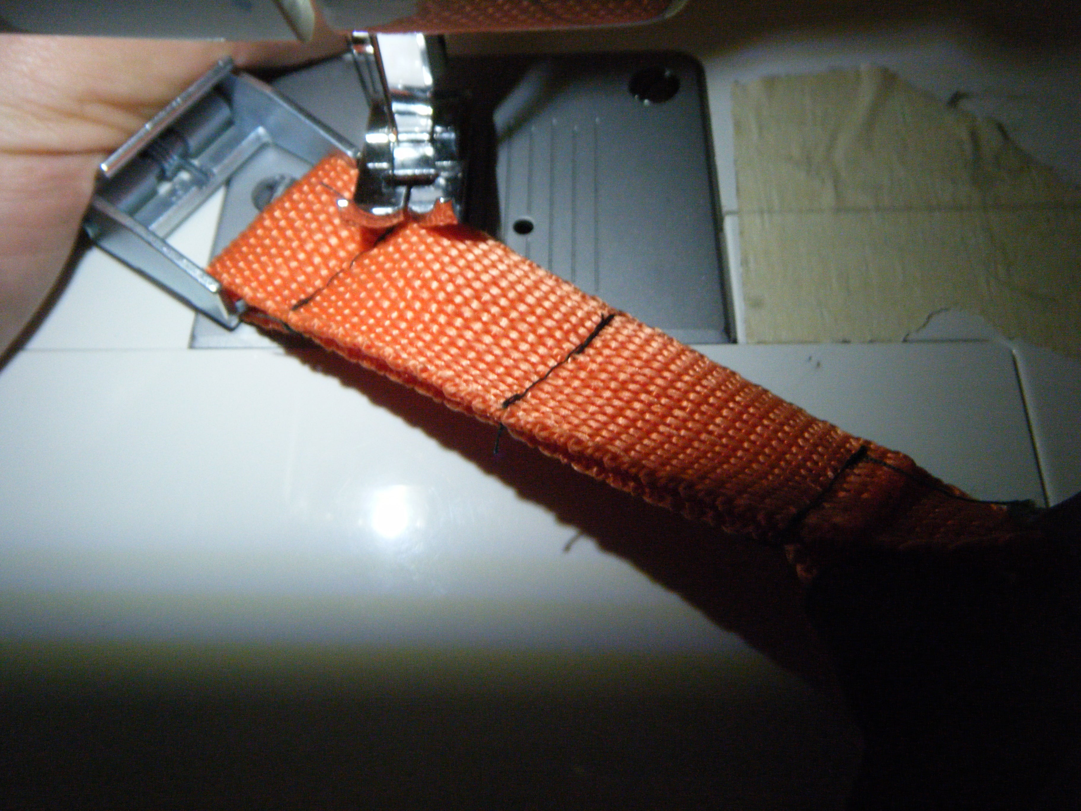 Leave enough of an overlap to sew a couple of "X in boxes". These seem to be standard when sewing webbing. Cut the webbing to the appropriate or desired length, remembering to apply heat to the cut edges so the nylon melts and sticking it to itself. This prevents fraying.