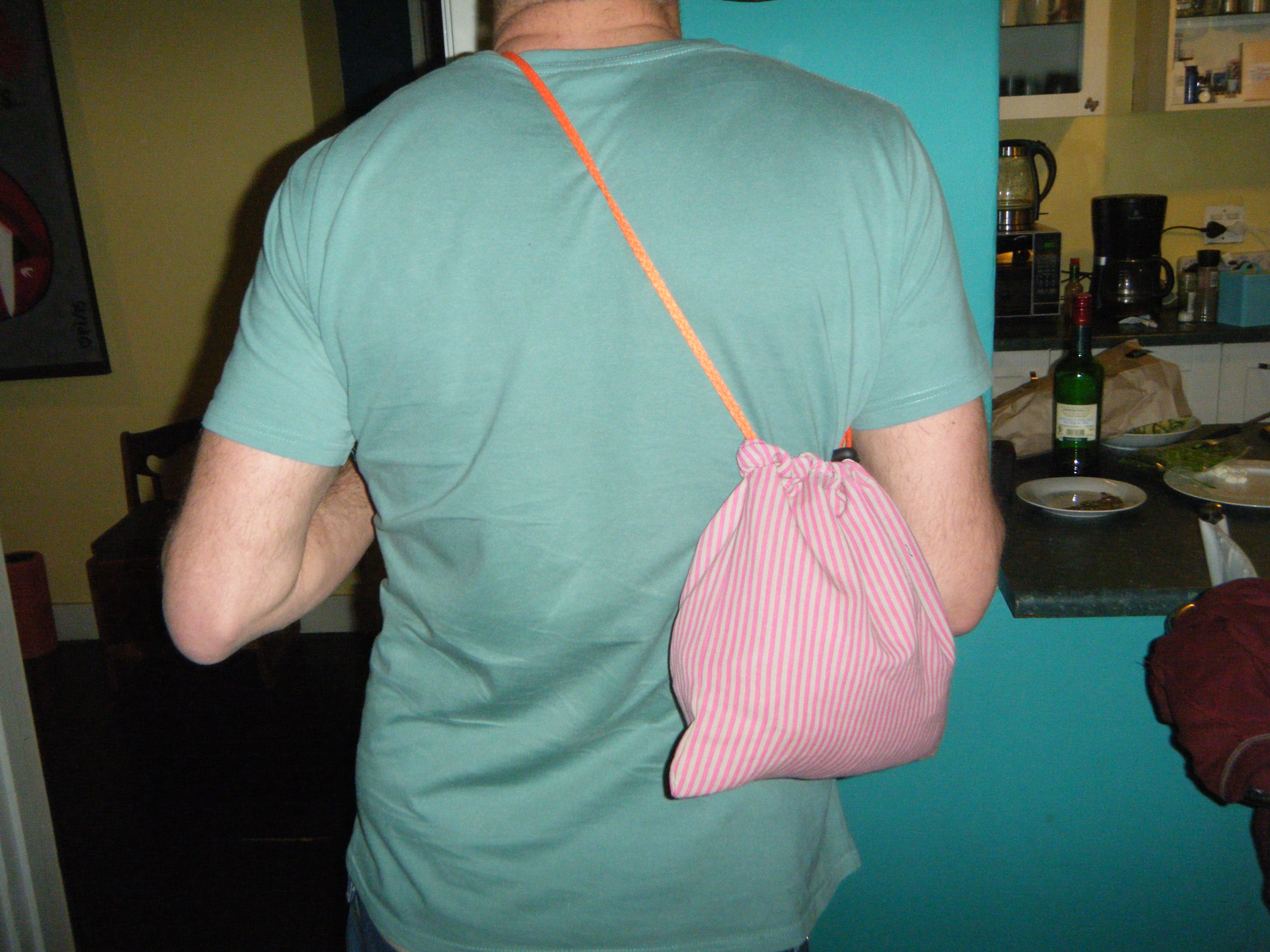 You create a simple bag by folding over some fabric and sewing the two sides up - leaving a gap at the top of one side so you can fold it over to make a channel - as seen in the folowing image