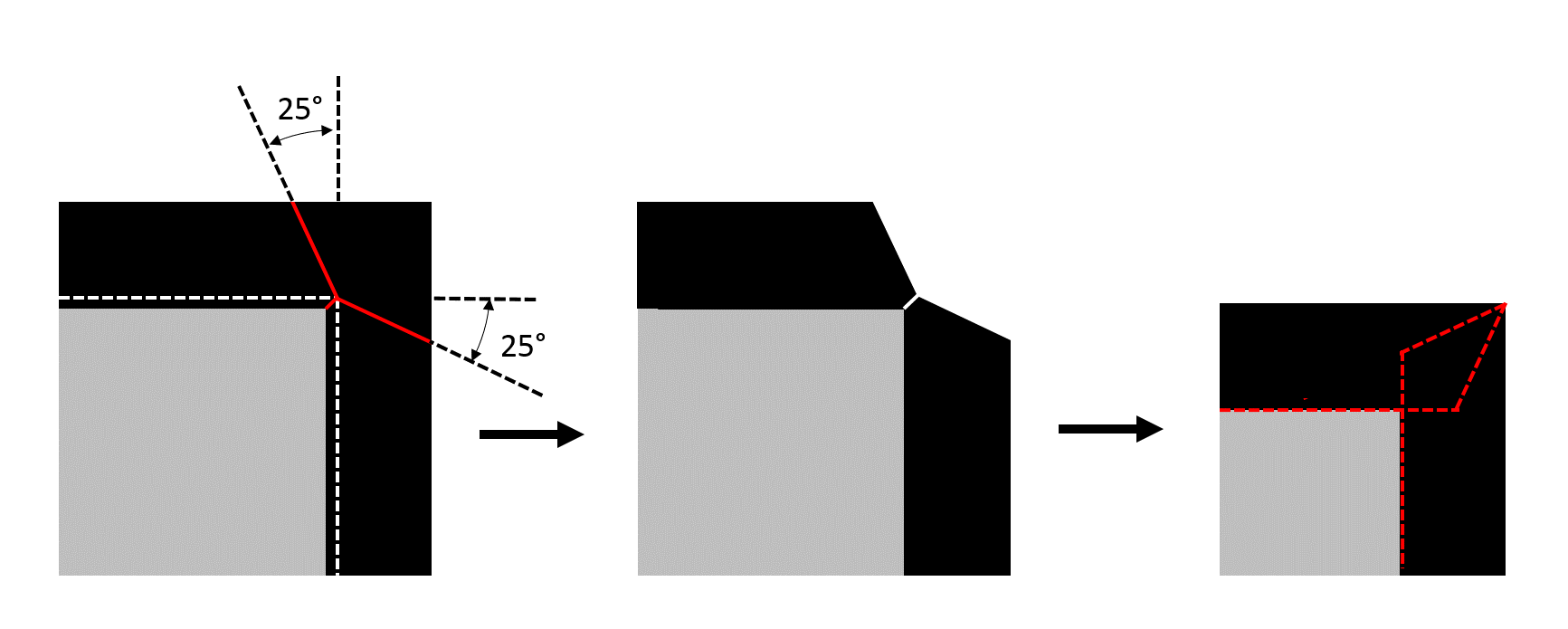 - Cut the corners of the vinyl before to fold it as in the next picture. Leave a small offset corresponding the width of the cardboard (2 mm, represented with white dotted lines), then cut with an angle of about 25° compared to the cardboard edges (represented with red lines).
