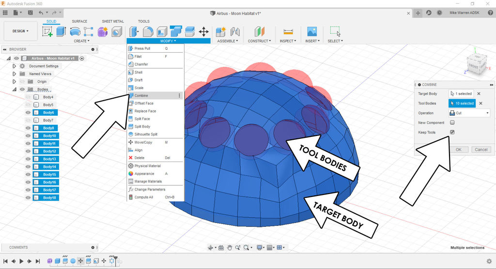 Use the faceted dome as the target body, and the circular pattern bodies as the tool. Since we want to keep the domes after we use them to cut openings, make sure to select keep tools checked. Click OK to finish the command.