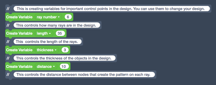 In building the next snowflake design, you can encourage your students to continue to play Frankenstein, because the control points to the algorithm are also clearly laid out in the first script.